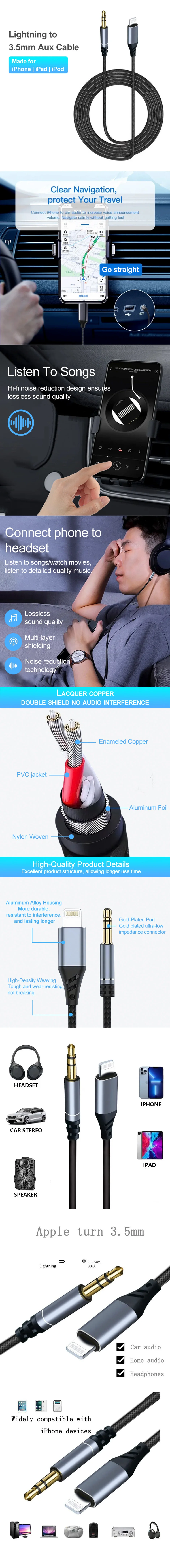 Dispositivo Compatible-Los cables de audio del coche son compatibles con Apple iPhone 13/13 Mini/13 Pro/13 Pro Max/12/12 Mini/12 Pro/12 Pro Max/SE/11 Pro Max/11 Pro/11/XS Max/XR/X/8/8 Plus/7/7 Plus, iPad Pro/Aire/Mini, El iPod toca sexta generación y así sucesivamente.