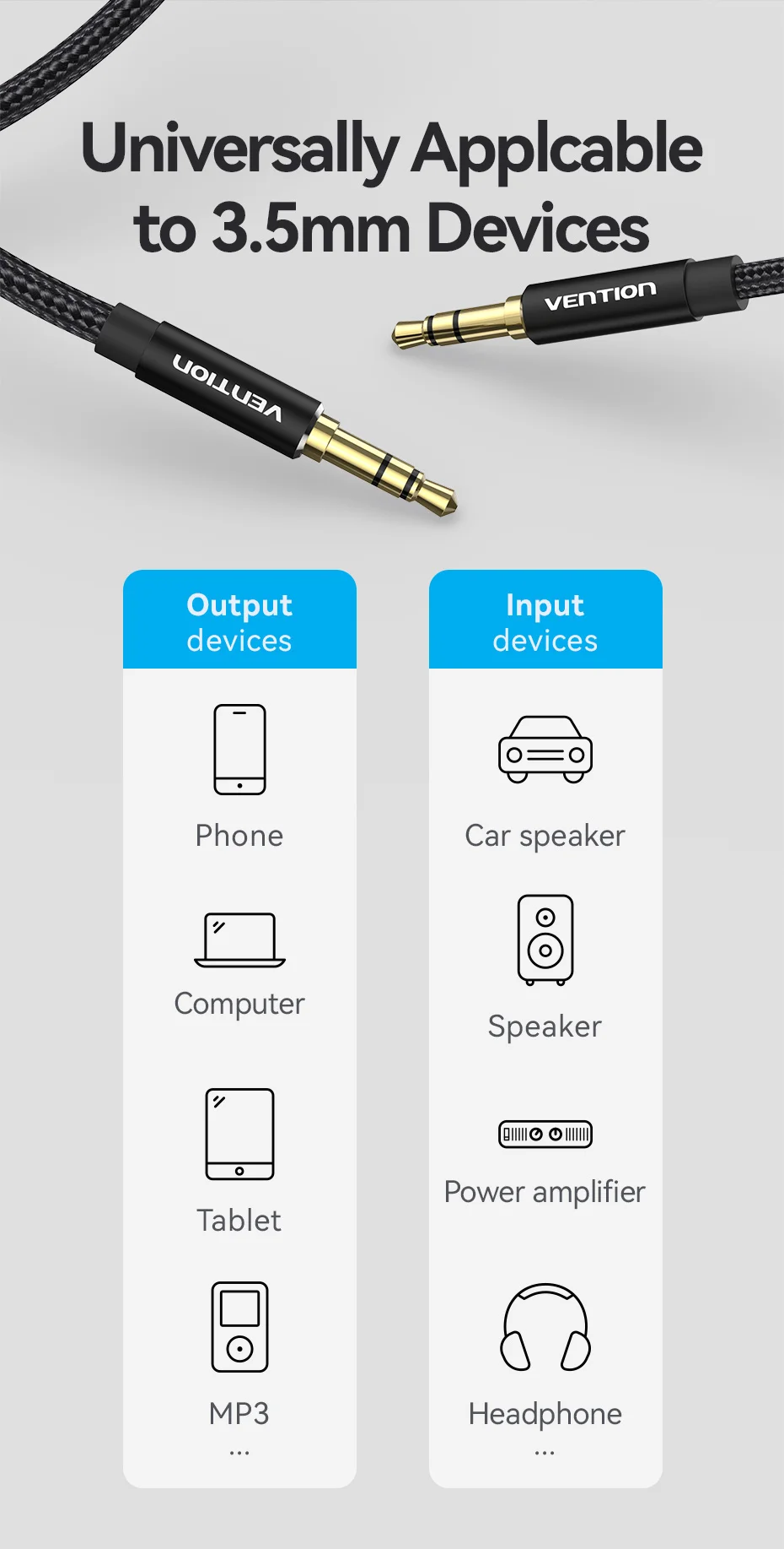 El cable Vention Aux está diseñado para ofrecer audio de alta fidelidad, lo que garantiza que cada nota y ritmo se escuchen con claridad cristalina.El blindaje trenzado del cable bloquea eficazmente el ruido externo, permitiéndole sumergirse en su música sin distracciones.Ya sea que esté escuchando su lista de reproducción favorita en el automóvil o disfrutando de un festín musical privado con sus auriculares, este cable promete devolver la belleza de la música a sus oídos.