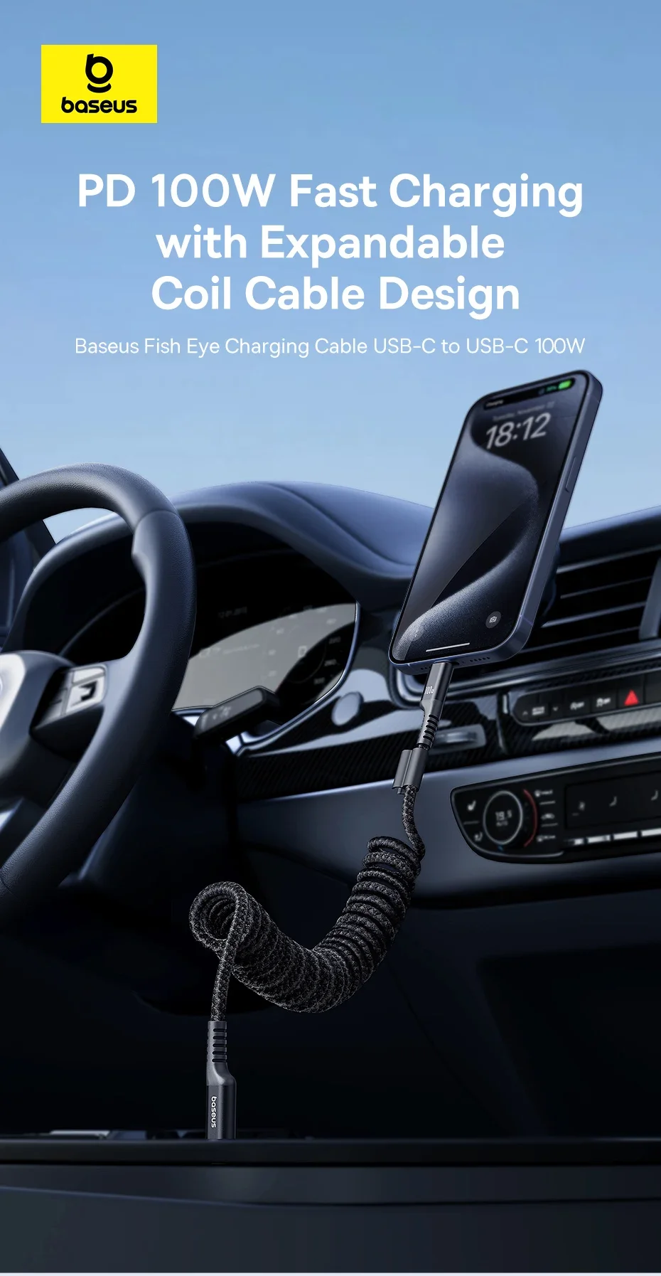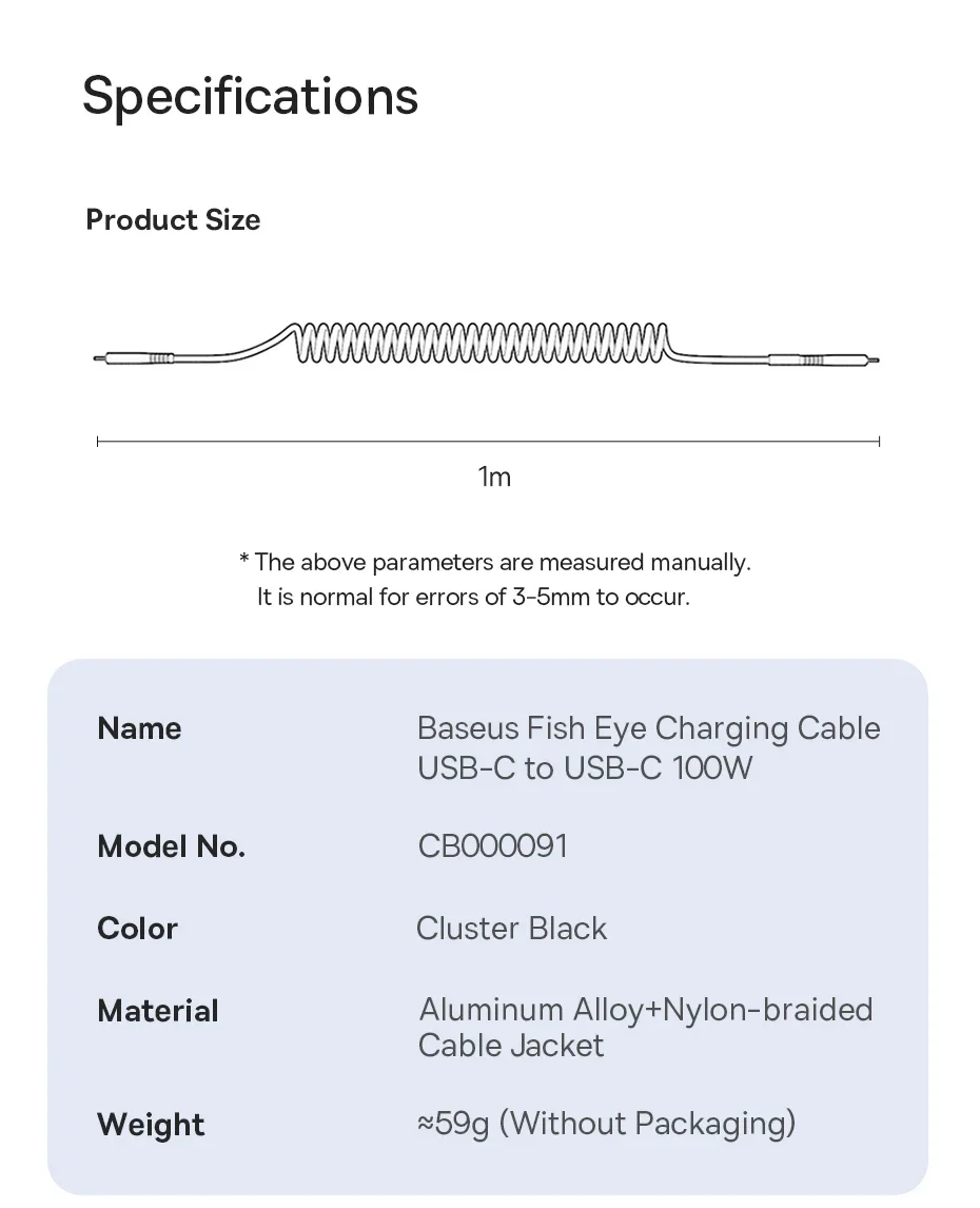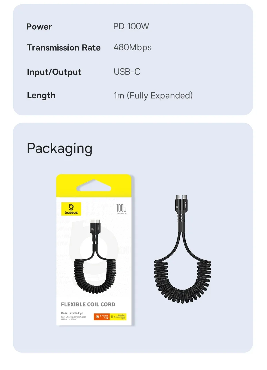 Comprar Cable Baseus 100W tipo C a tipo C para iPhone 15 Cable cargador de teléfono de coche con resorte retráctil para Macbook Pro