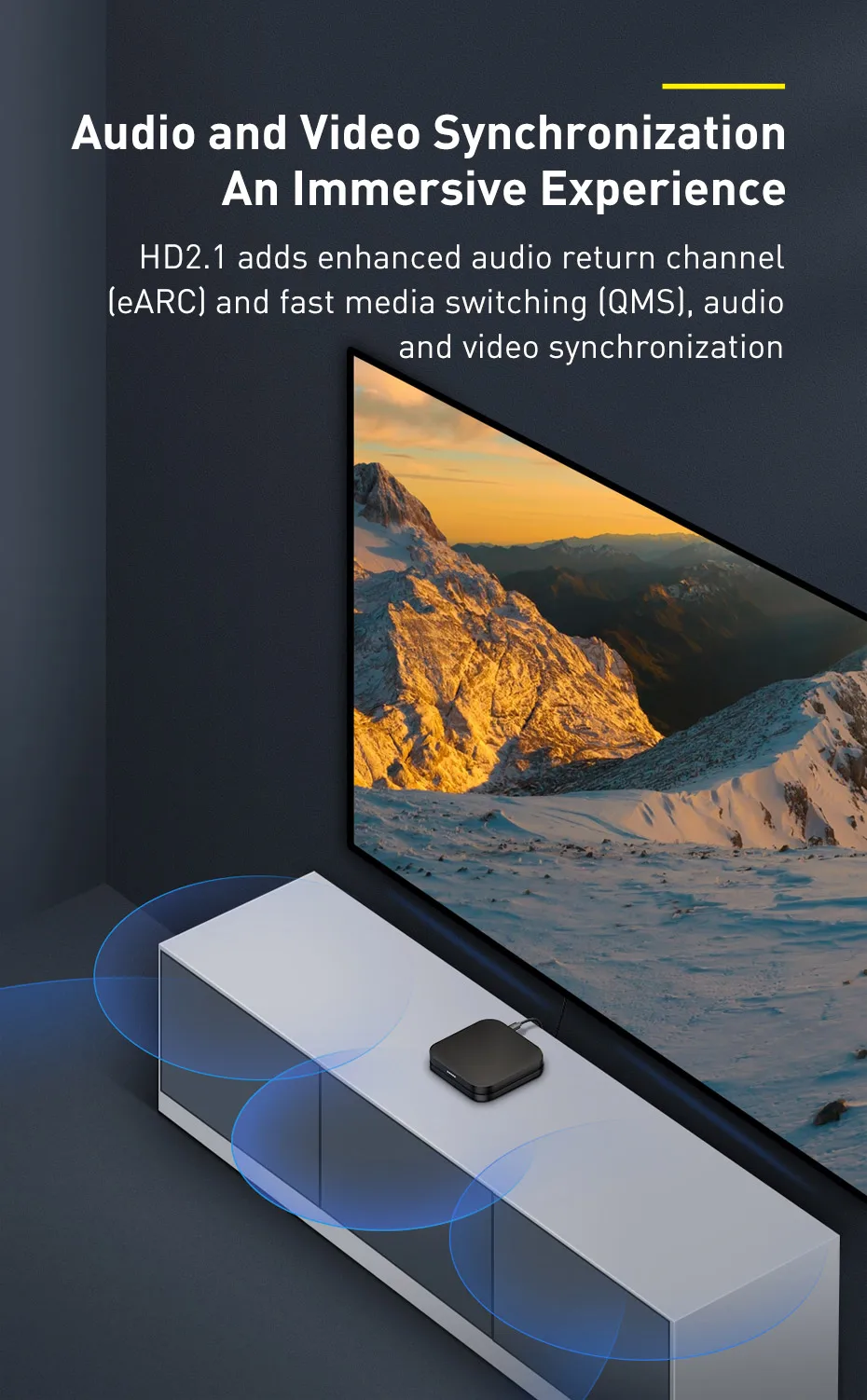 HDMI2.1 agrega un canal de retorno de audio mejorado (eARC) y una conmutación rápida de medios (QMS), sincronización de audio y video.