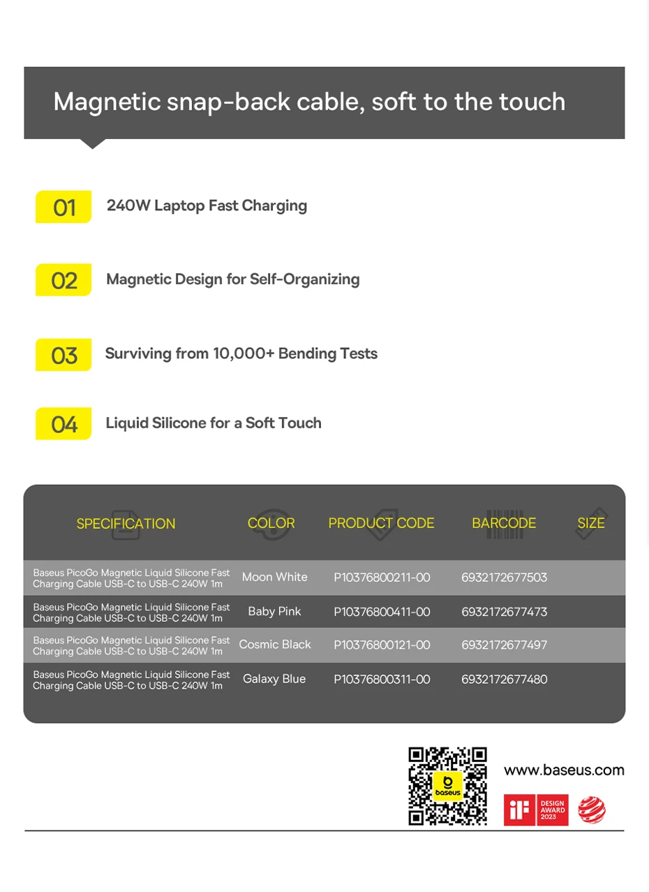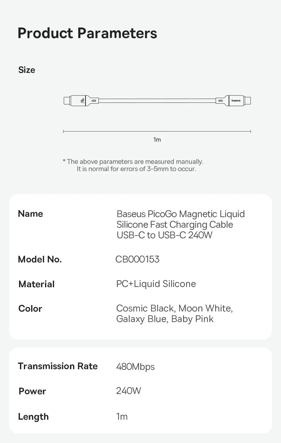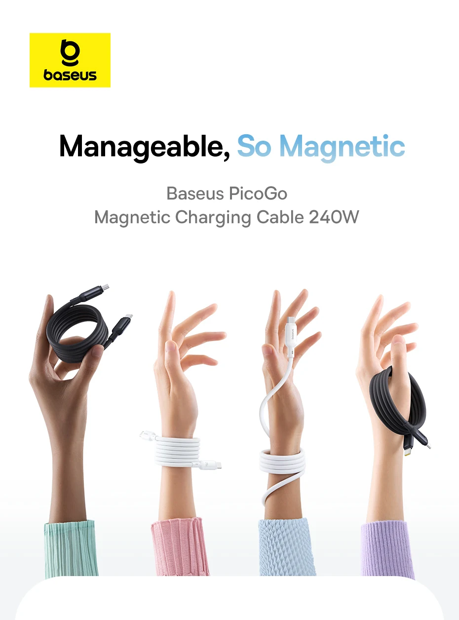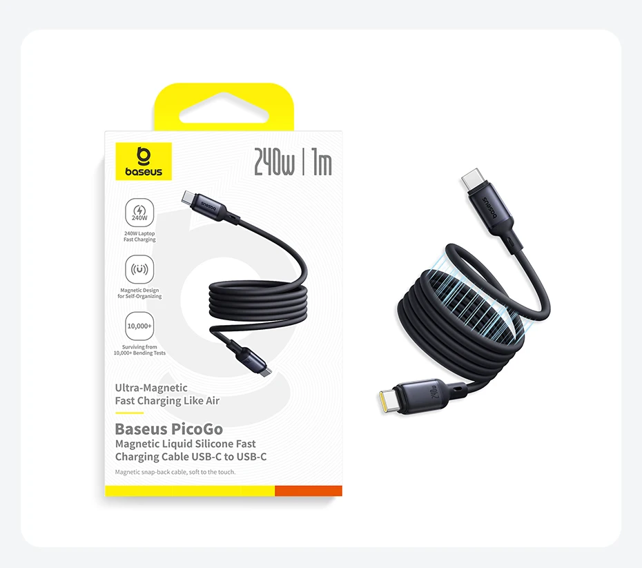 Comprar Cable Baseus Picogo USB C de 240W para iPhone 16 15, Cable magnético de carga rápida tipo C para Macbook, Cable de silicona líquida para Samsung