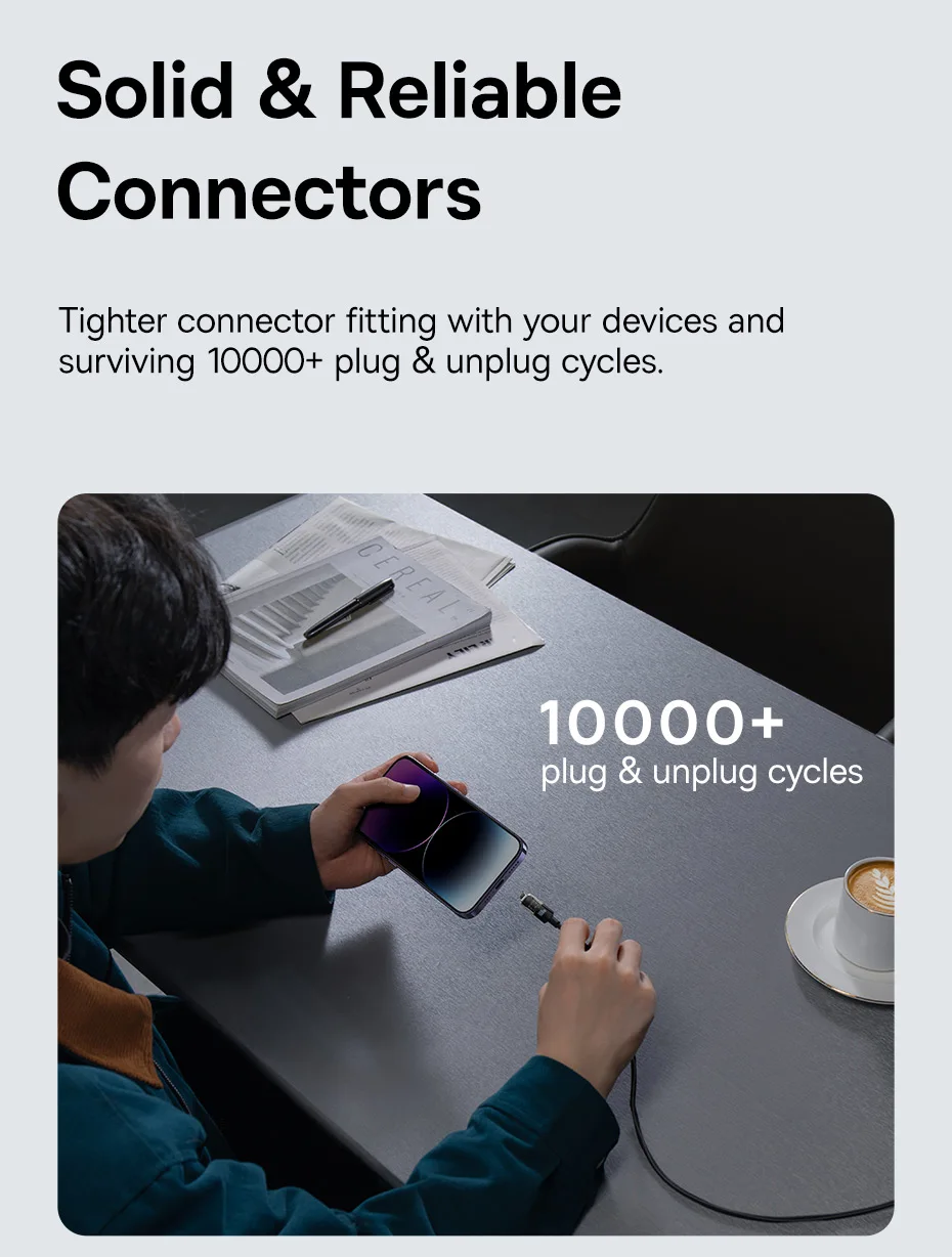 Conector más ajustado que se adapta a sus dispositivos y sobrevive a más de 10000 ciclos de conexión y desconexión.