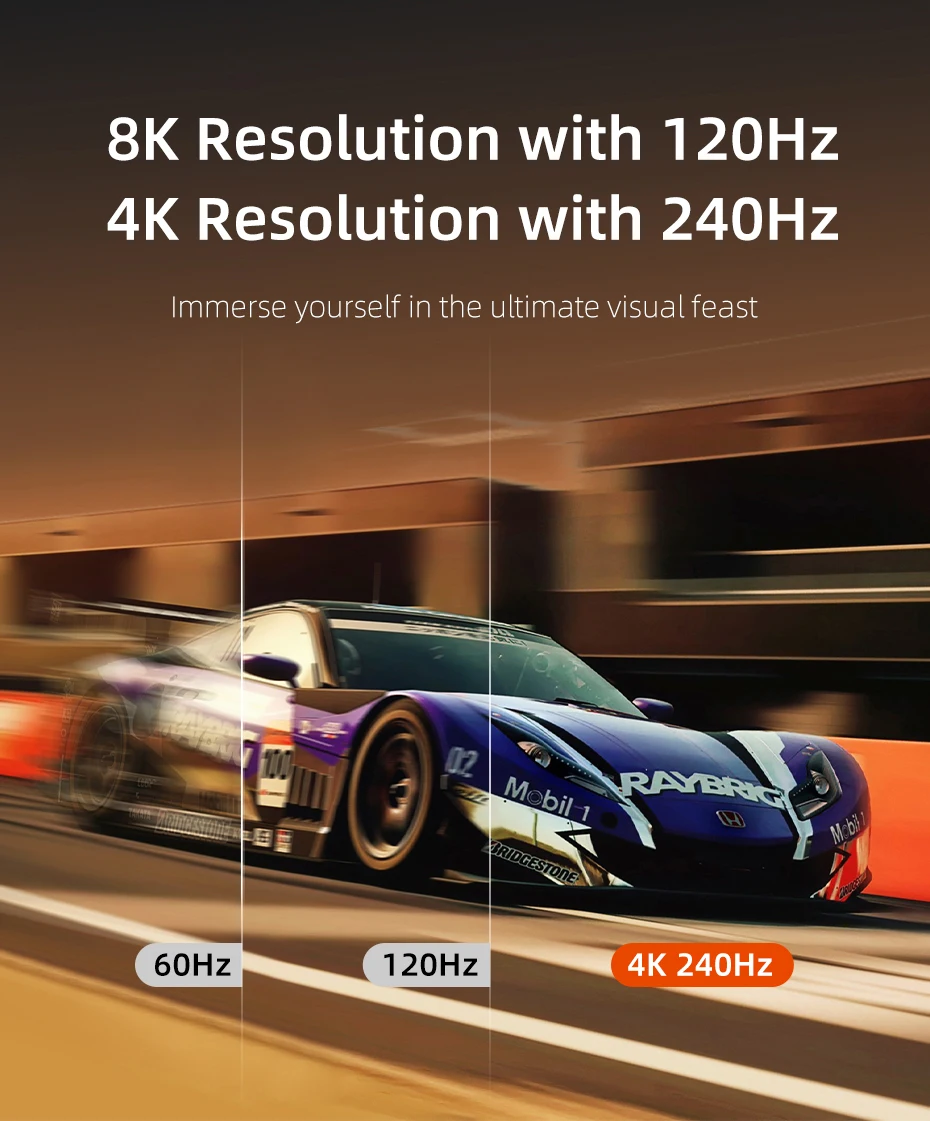 Di adiós al retraso y al tartamudeo.Nuestro cable DisplayPort 2.1 ofrece una frecuencia de actualización increíblemente rápida de 240 Hz, por lo que cada fotograma se reproduce con precisión.Dynamic HDR intensifica cada sombra, mientras que el audio de 32 bits da vida a cada sonido del juego.Además, disfrute de una experiencia de juego multipantalla con Transmisión Multi-Stream (MTS).
