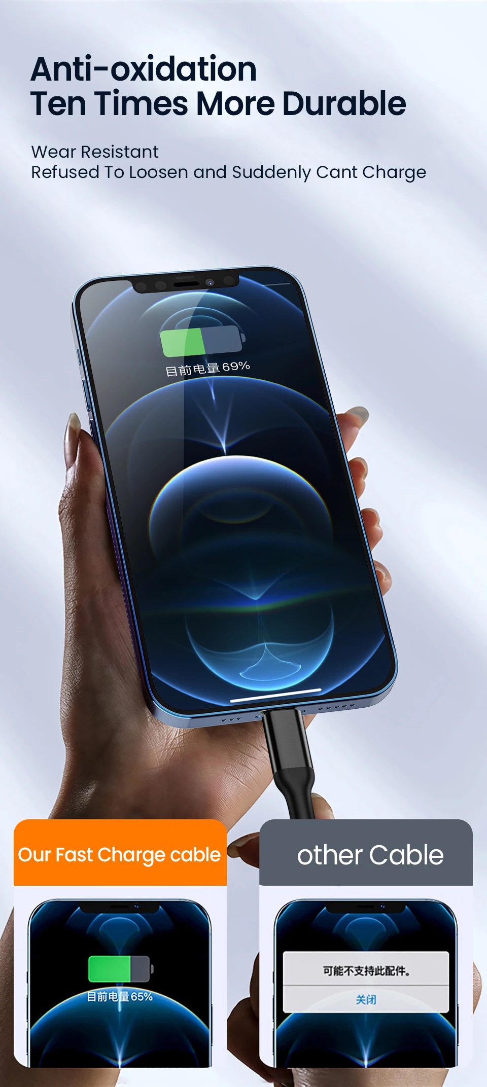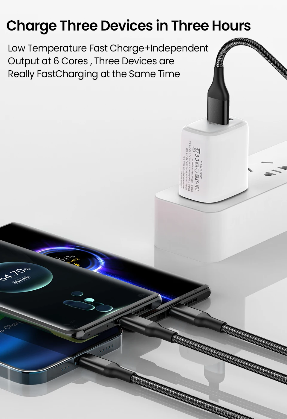 Este modelo es un cable de carga trenzado de nailon con alambre de cobre grande, carga rápida, resistencia al estiramiento, anti-bobinado, diseño de carcasa compacto, exquisito, proceso de moldeo por inyección completo, sin pegamento, sin entorno climático causará subfenómeno de las carcasas, moderno y rompe el estilo tradicional