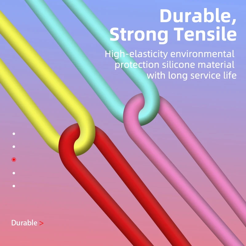 La silicona líquida tiene las características de alta flexibilidad, gran durabilidad, seguridad y respeto al medio ambiente, etc. No necesita preocuparse de que su bebé y sus mascotas muerdan el cable de carga rápida USB C.