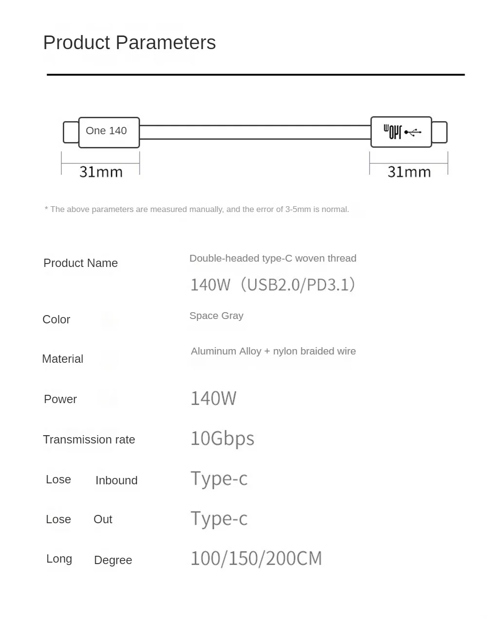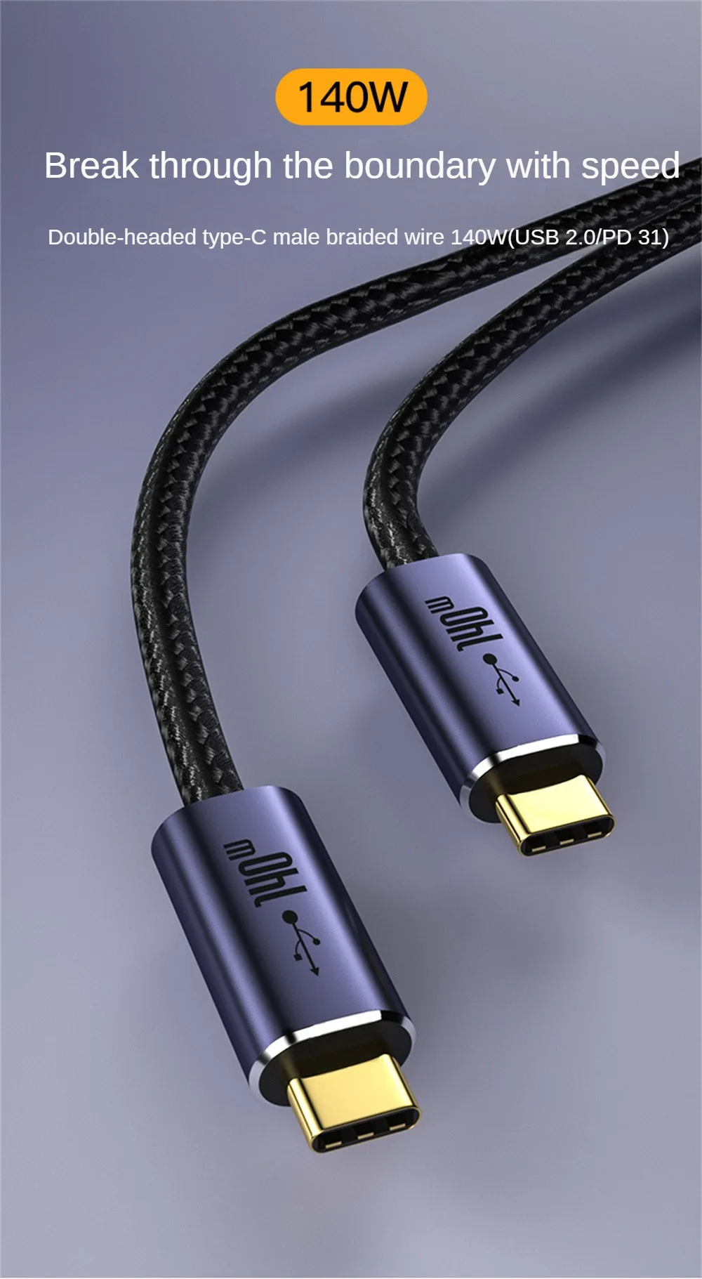 Nombre del producto: cable trenzado macho tipo C de doble cabeza 140W(USB2.0/PD3.1)