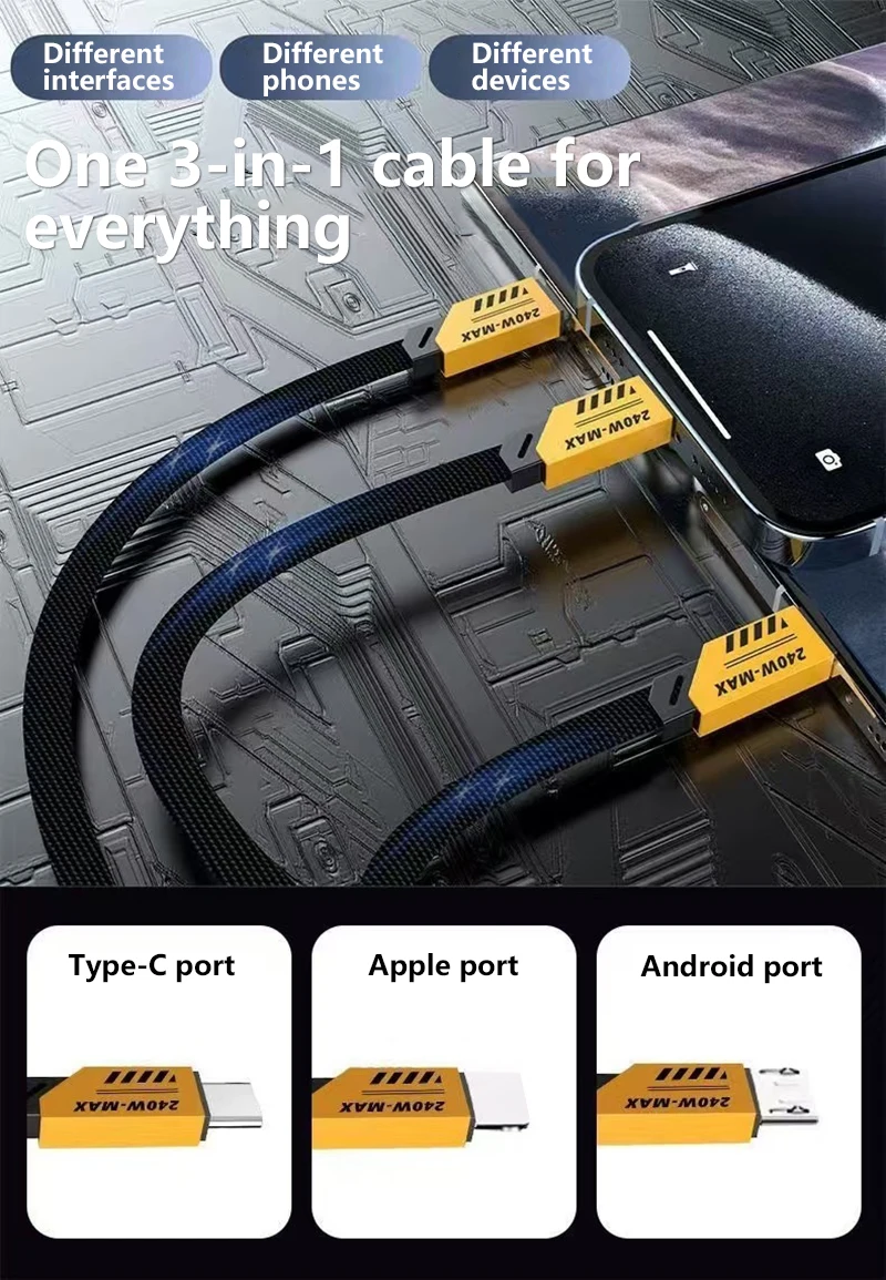 Cable de carga rápida 3 en 2 de 240W para Cable cargador Micro USB tipo C Cable de datos móvil de carga rápida multipuerto para iPhone Huawei