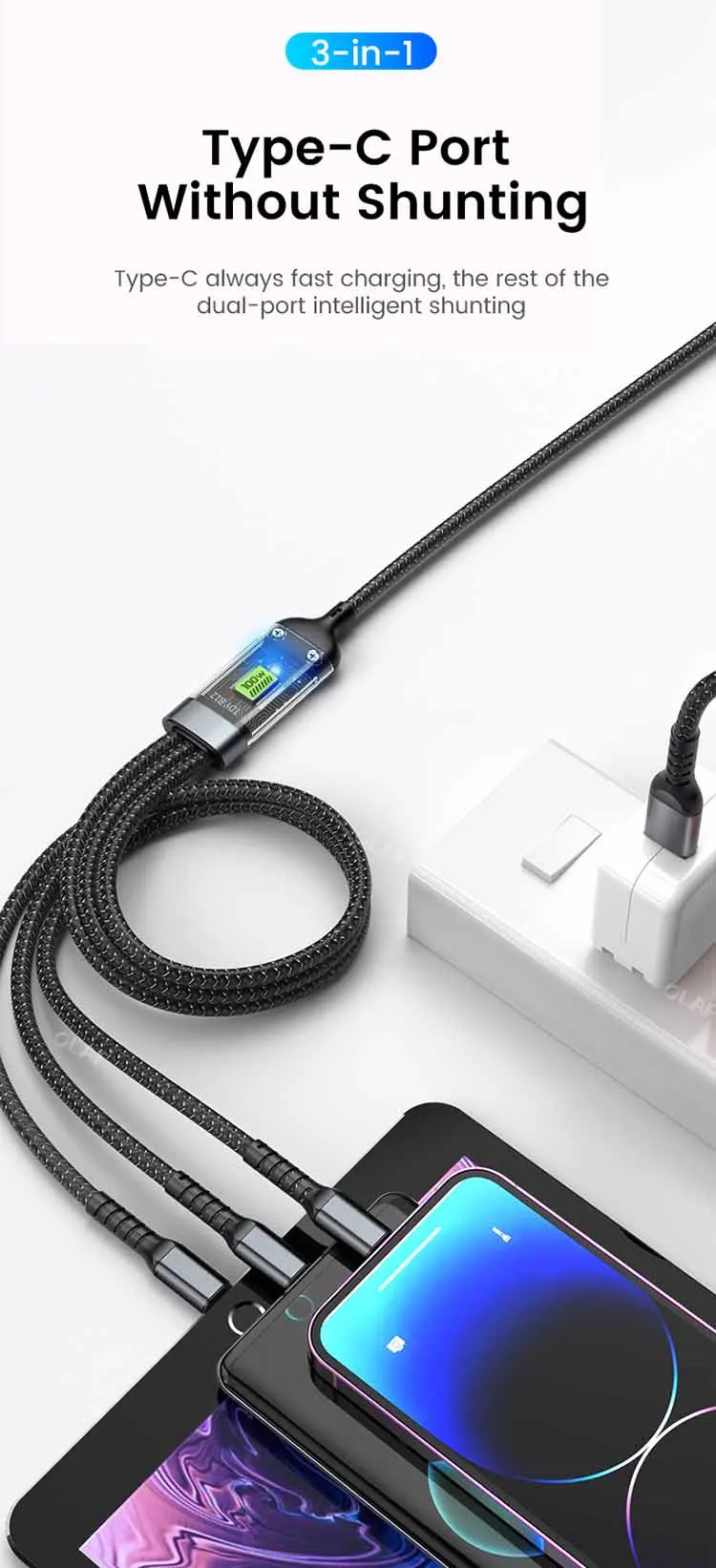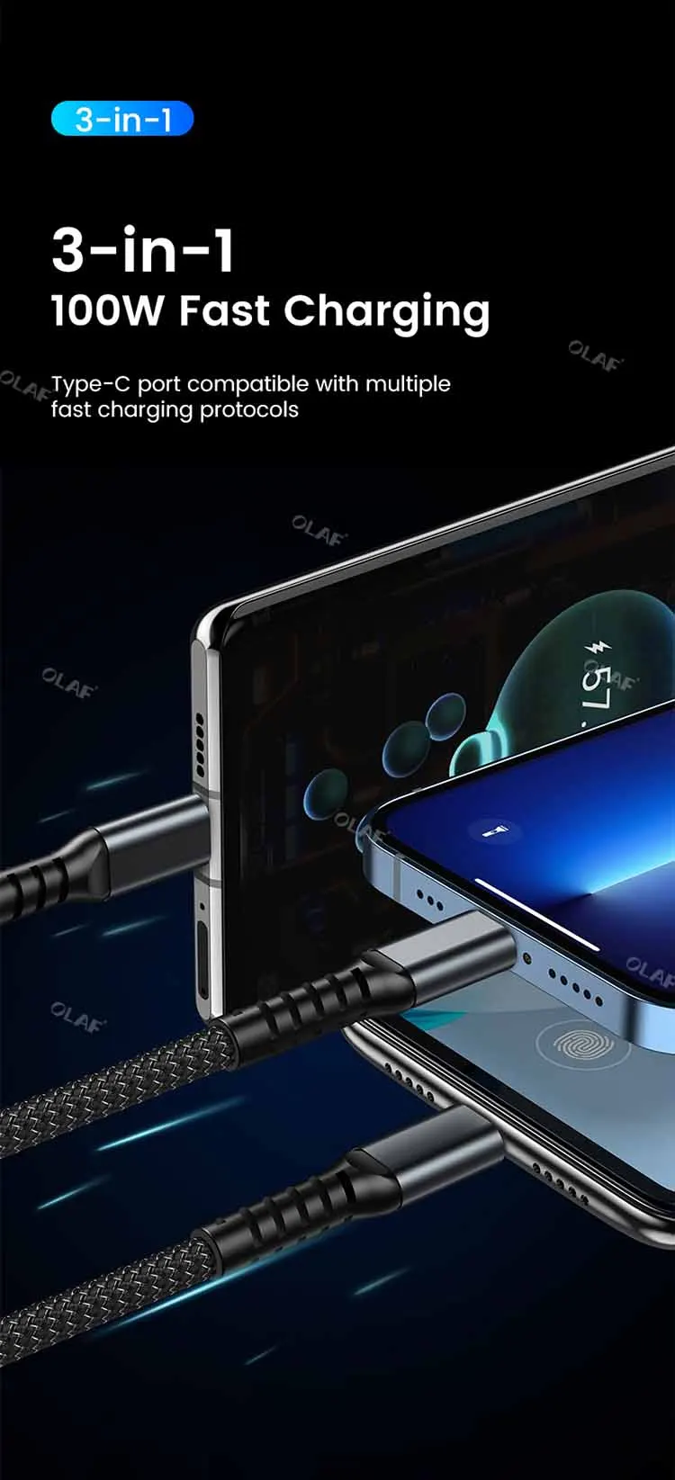 Cable de carga rápida 3 en 1, 100W, 6A, para iPhone 14, 13, 12, Xiaomi, Huawei, Cable USB tipo C para Samsung S20, S21, Cable de transferencia de datos