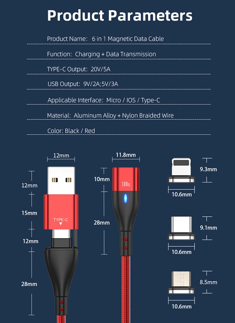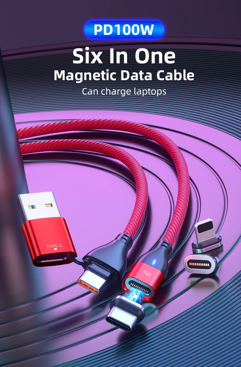 Cable de carga rápida magnético 6 en 1 PD 100W para Cable cargador de iPhone Cable Micro USB tipo C a USB C para Xiaomi Samsung Macbook