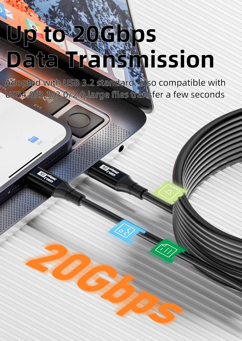 【 Velocidad de transmisión súper alta de 20Gbps 】El cable USB3.2 de 100W puede proporcionar una velocidad de transmisión de 20Gbps, lo que le permite transferir videos, películas, música e imágenes de alta definición en un segundo, logrando un intercambio de datos más rápido que los cables de 10Gbps.