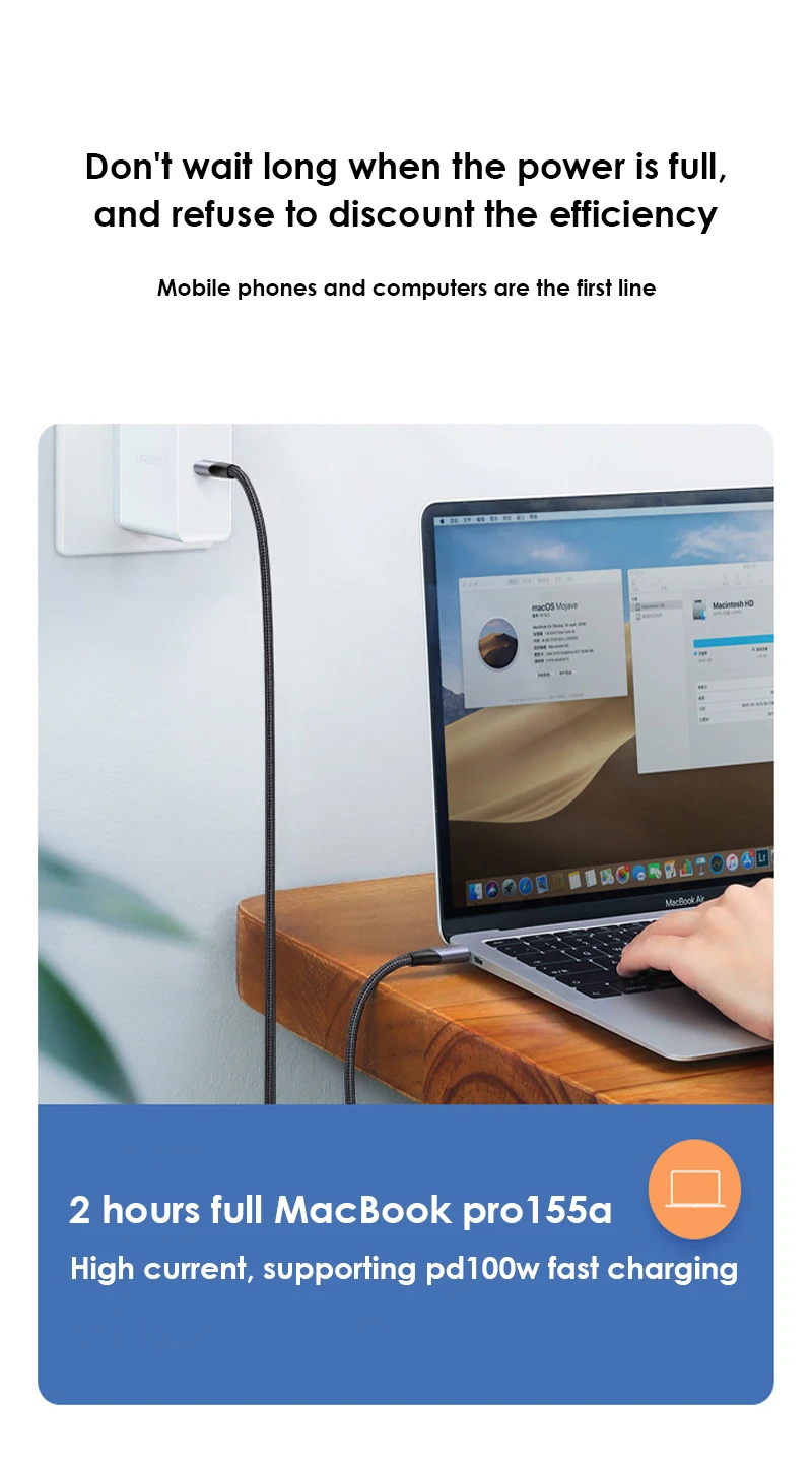 4. El chip E-Marker incorporado puede igualar la corriente requerida por el equipo de forma inteligente, controlar el voltaje de forma automática y razonable, y se puede cargar de forma segura y rápida sin dañar el equipo.