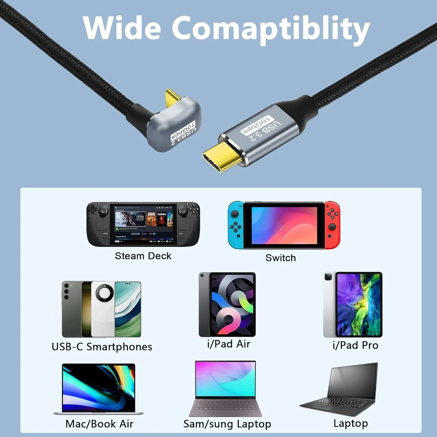 Cable USB C 3.2 Gen 2 en forma de U: el cable de carga rápida tipo C admite una velocidad de carga máxima de 100 W (20 V/5 A).USB3.2 admite transferencia de datos de 10 Gbps.Y puede transmitir la pantalla (4K@60Hz), admite señal de audio y vídeo.