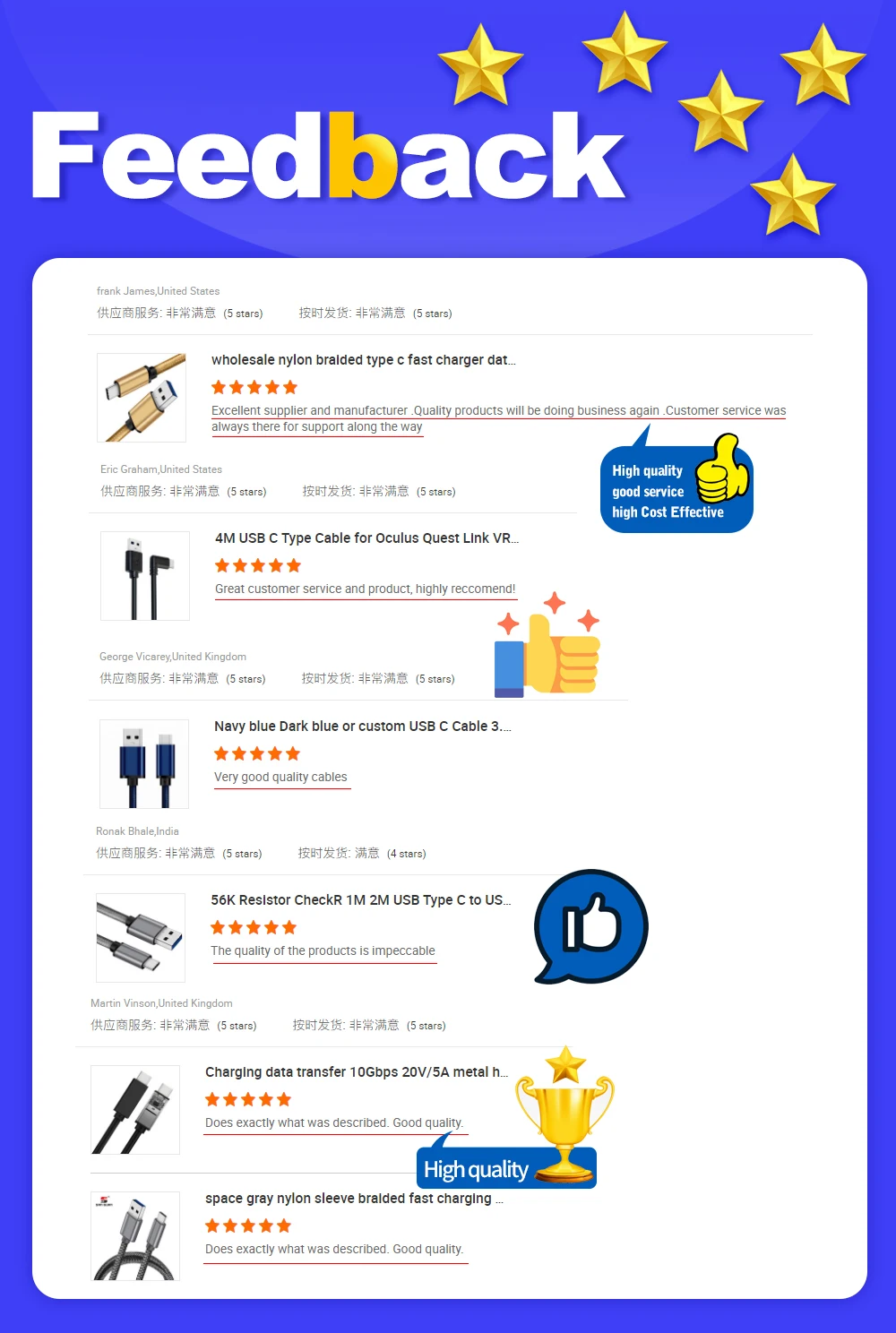 Nombre de productos Micro cable USB tipo C a USB2.0 Velocidad de datos 480Mbps Función Carga rápida, datos y soporte OTG Longitud 0,2 m 1m/personalizado Garantía 12 meses Certificado CE.ROHS.FCC.EMC Servicio personalizado Empaquetado de logotipo y diseño de patrón