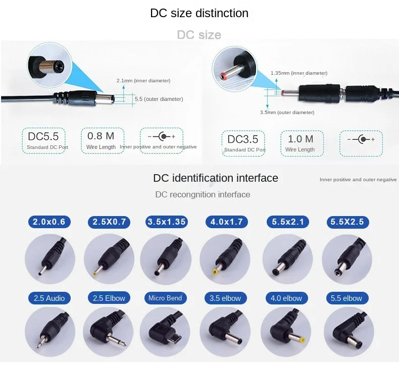 4. Enchufe de CC (5,5*2,1) (5,5*2,5) (3,5*1,35) (4,0*1,7) (se puede personalizar varios cabezales de CC)