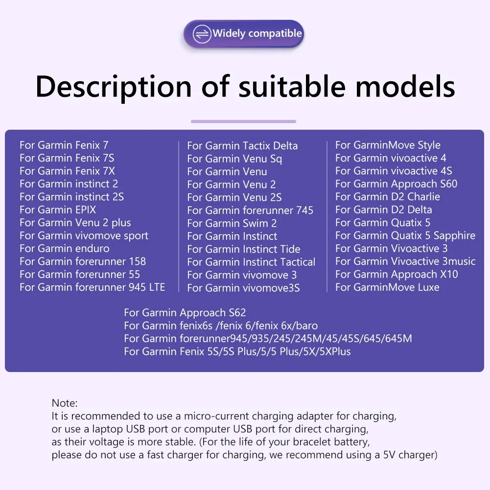 1.Compatibilidad:Diseñado para Garmin Fenix 7 7S 7X 6 5 5X/Venu 2/Forerunner 945 y otros relojes inteligentes.