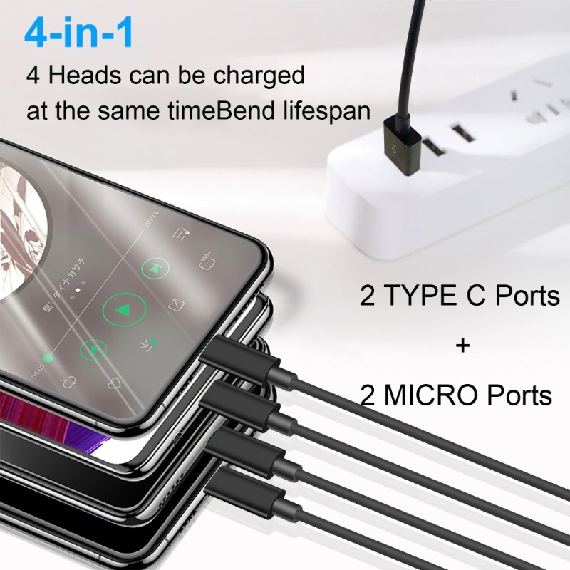 Cable de carga USB de 4 vías, Cable de carga multipuerto portátil de 1 en 4 salidas USB a 2x tipo-c + 2x línea de Cable de extensión de microalimentación K1KF