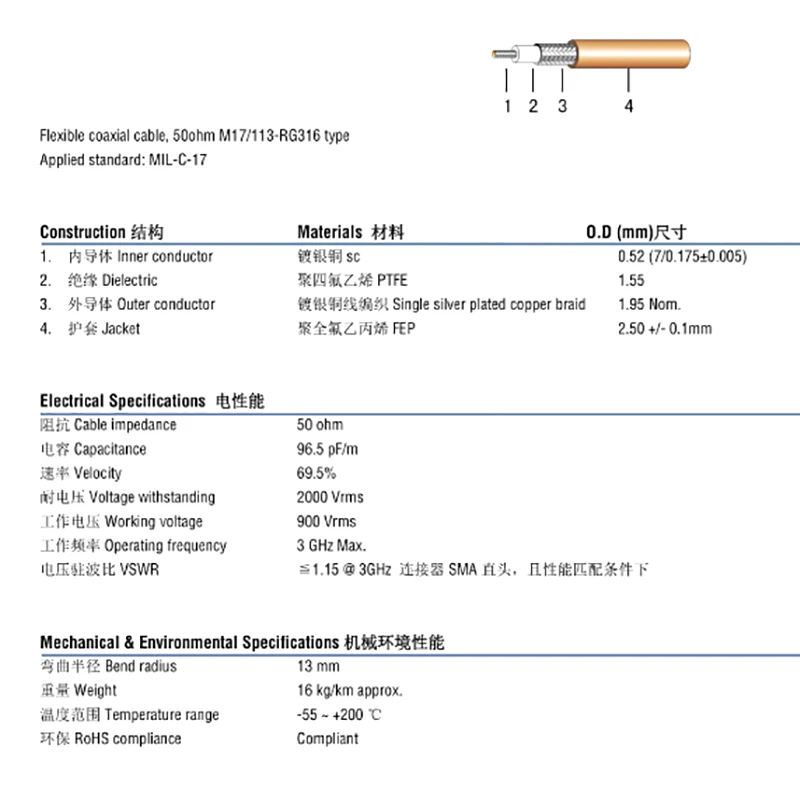 Comprar Cable Coaxial RG316 PTFE de alta temperatura, M17/113 Rf, 50ohm, coleta