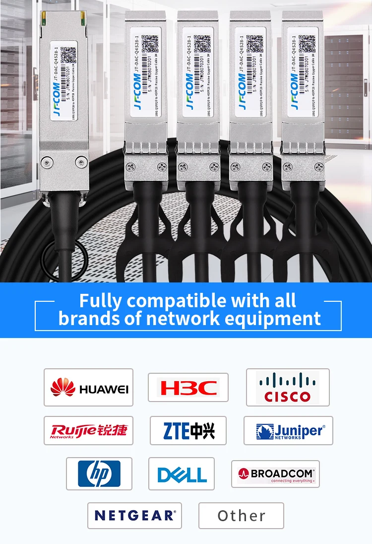 Descripción generalLos ensamblajes de Cables de cobre pasivos JT-COM G QSFP28 (100) de JT-DAC-Q4S28 son de alto rendimiento, rentables para las interconexiones de equipos SFP28 y qsfp28. Los cables híbridos cumplen con las especificaciones SFF-8402 y SFF-8665. Ofrece un bajo consumo de energía, aplicaciones de interconexión de corto alcance. El cable de cada carril es capaz de transmitir datos a velocidades de hasta 25 Gb/s, proporcionando una tasa agregada de 100 Gb/s.CaracterísticasCompatible con 100 Gbps a 4x25 Gbps