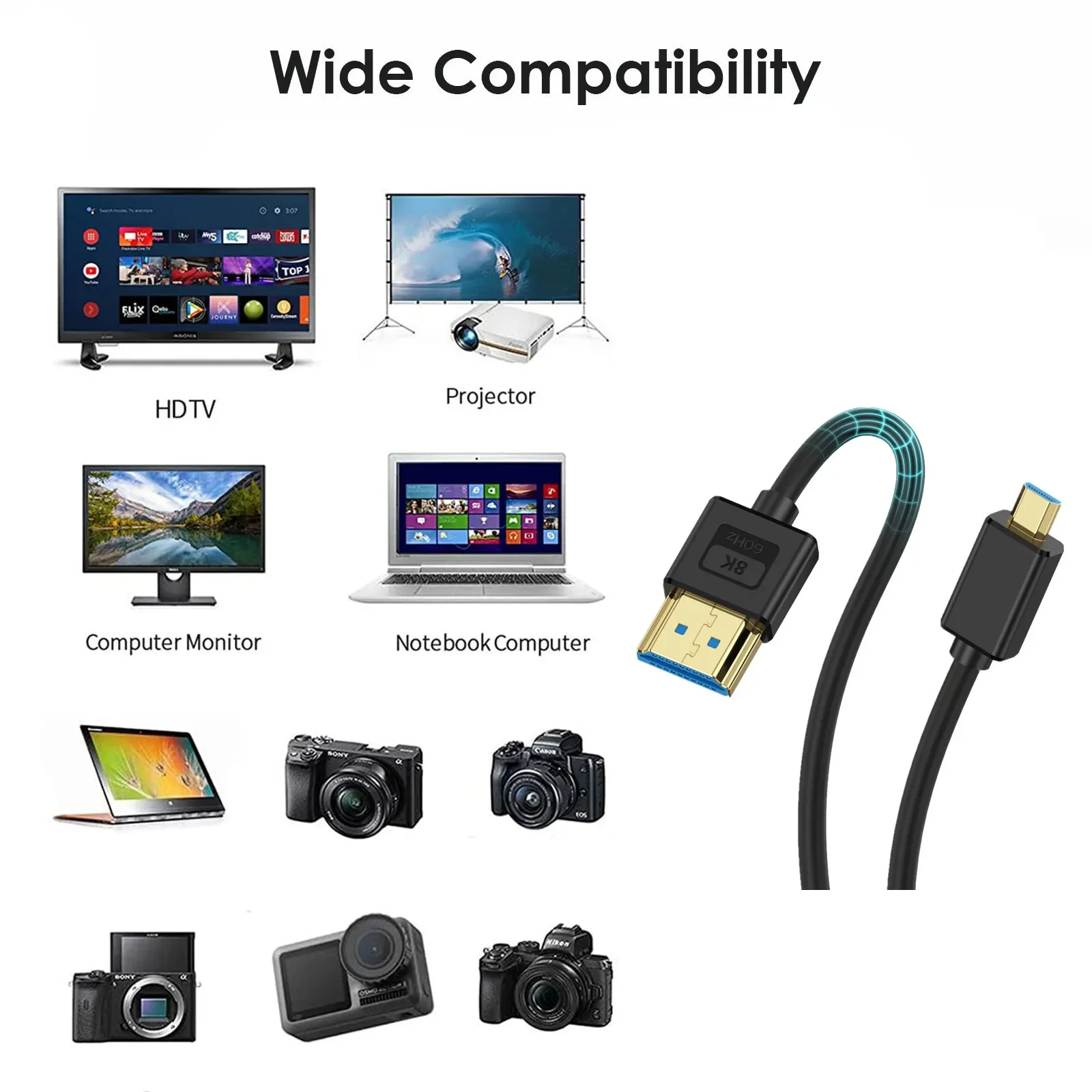 El cable HDMI 8K es compatible con computadoras, portátiles, monitores, proyectores, televisores de alta definición, reproductores de Blu ray, Fire TV, Apple TV, PS5, PS4, Xbox One, Switch y más dispositivos con puerto HDMI.También es compatible con versiones HDMI 2.0b/2.0a/1.4/1.3/1.1.1.1.Admite modos espejo y expansión.