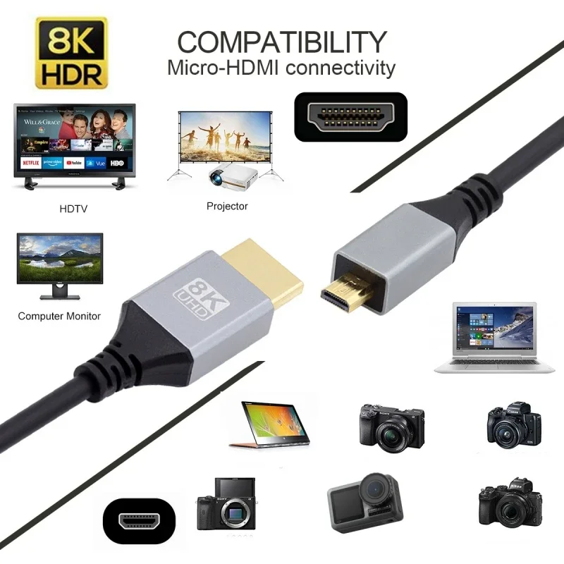 Comprar Cable compatible con Micro HDMI a HDMI de 8K 2,1, adaptador de alta velocidad 3D 4K 5K para cámara PS4 5 GoPro Hero 7 6 5 Sony A6000 Nikon Canon