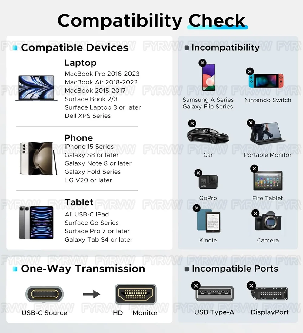 【Amplia compatibilidad FYRVW】- Adaptador de cable USB-C a HDTV compatible con los puertos Thunderbolt 3 y Thunderbolt 4.Compatible con MacBook Pro 15''/ 13'' 2016 2017 2018 2019 y posteriores, MacBook 2016 y posteriores, iPad Pro, Dell XPS 13/15, Mac Mini 2018, 2020, HP Spectre x360, Galaxy Note 10/Note 9 y Samsung Dex teléfono/portátil, ThinkPad X1, Google PixelBook2, ASUS T303au, HUAWEI MateBook E/X, Razerbook, Yoga 910/920, Surface Book 2, Surface Go.NOTA: Asegúrese de que su host USB-C admita el modo DP Alt.