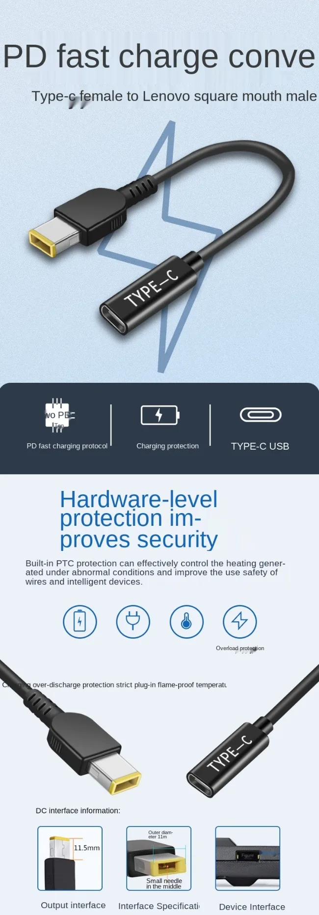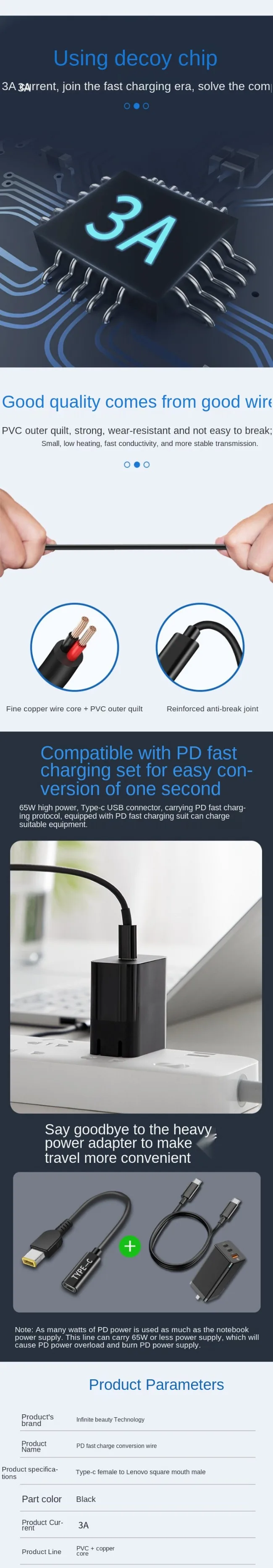 1.Con un chip inductor PD, la fuente de alimentación tipo C se puede convertir en una interfaz de alimentación para computadora portátil para la interfaz cuadrada de la serie Lenovo.