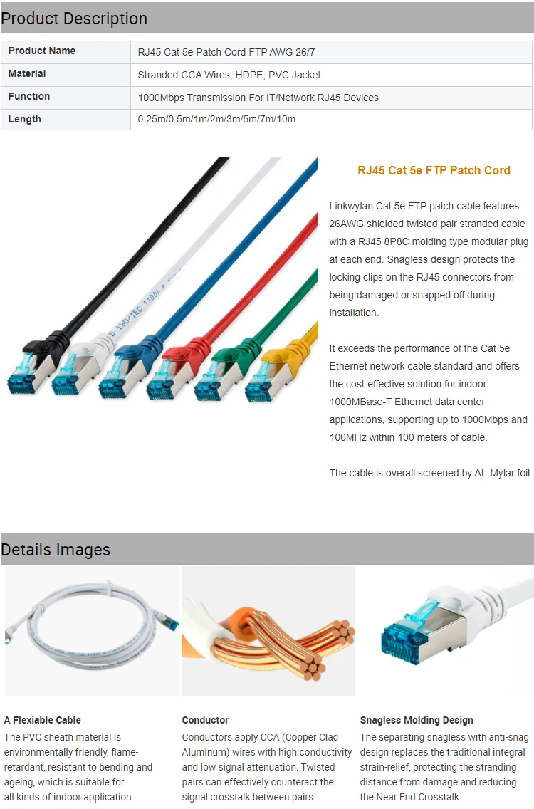 Comprar Cable de conexión Ethernet Cat 5e RJ45, accesorio de red Cat5e FTP, 0,25/0,5/1/2/3/5/10m, 5 unidades por paquete