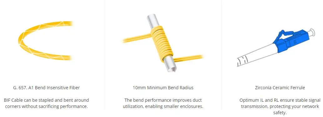 El cable de fibra óptica sensible a la flexión tiene una cubierta de PVC con Clasificación de Inflamabilidad estándar de la industria y un conector de fibra simple que cumple con EIA/TIA 604-2 para redes de cableado de alta velocidad.