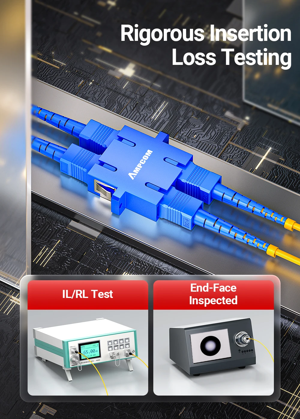 Rectificado preciso de la cara final del UPC para garantizar una transmisión de datos estable. Pérdida de inserción ≤ 0.2dB, pérdidas de retorno ≥ 50dB