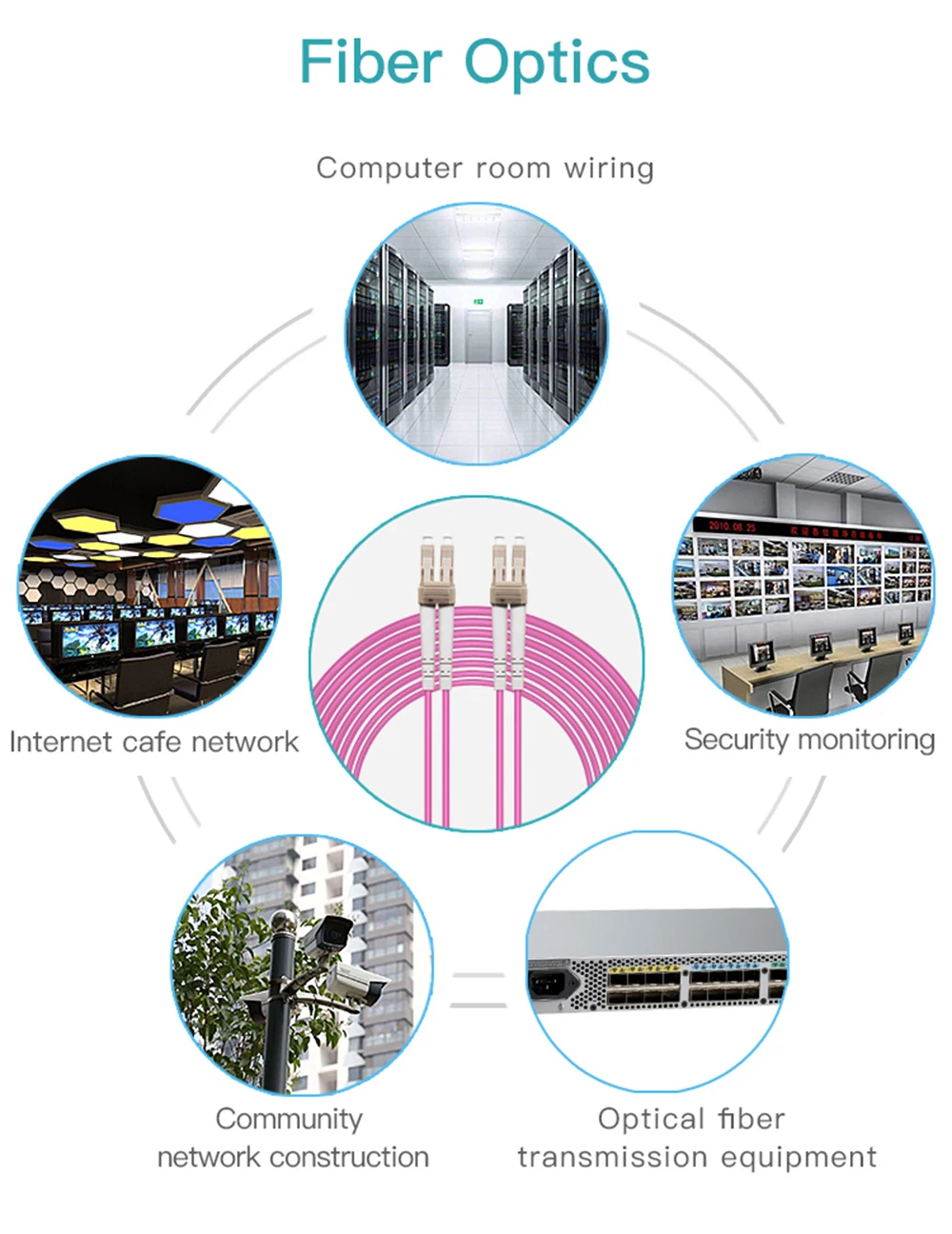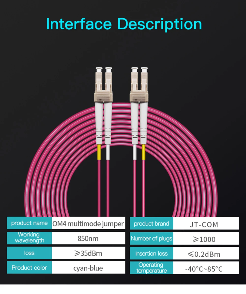 El Cable de conexión de fibra dúplex OM4 es un cable de fibra óptica cubierto en cada extremo con conectores que le permiten conectarse rápida y convenientemente a CATV, un interruptor Óptico u otro equipo de telecomunicaciones. Con una gruesa capa de protección, se utiliza para conectar el transmisor óptico, el receptor y la caja de terminales. Esto se conoce como "cableado de estilo de interconexión".CaracterísticaBaja pérdida de inserción