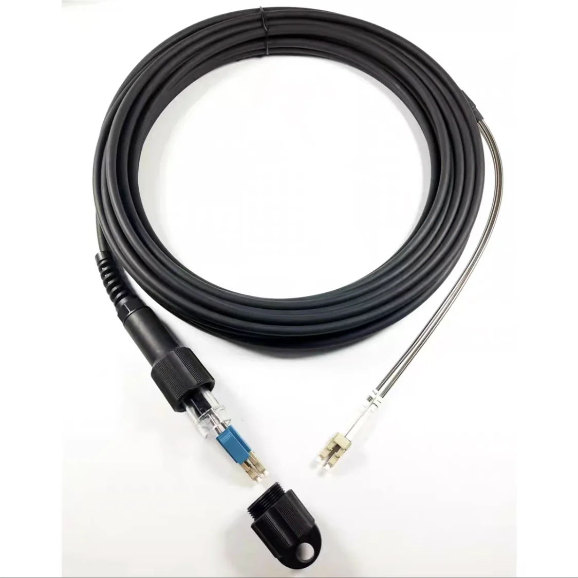 El conector del cable de fibra para exteriores está diseñado por USsource, que es la opción ideal para fibra a antena (FTTa) o cualquier otra aplicación ambiental severa, cumpliendo con las clasificaciones de sellado ambiental IP67.