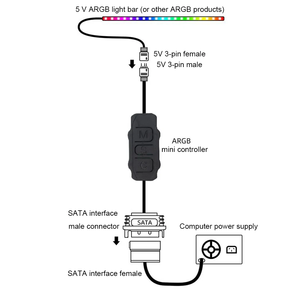 1. Cable extendido para una conectividad perfecta:La interfaz de 3 pines de 5V presenta un diseño de cable extendido de cable de controlador ARGB, lo que garantiza conexiones convenientes y seguras. Diga adiós a las conexiones sueltas y los cables que son demasiado cortos. (Nota: Este producto utiliza una interfaz de alimentación SATA conectada directamente a la fuente de alimentación del ordenador, eliminando la necesidad de soporte de placa base para 5V 3-PIN ARGB para controlar la iluminación ARGB).