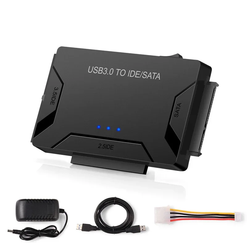 Descripción del producto:Este adaptador está diseñado como compatibilidad universal.Admite HDD/SDD SATA de 2,5” y 3,5” y HDD IDE de 2,5” y 3,5”.Además, puede funcionar con DVD-ROM, CD-ROM, CD-RW, DVD-RW, DVD+RW.Puede disfrutar de mucha comodidad a través del puerto USB 3.0 a una velocidad de hasta 5 Gbps (la velocidad real depende de la capacidad de su dispositivo) y también es compatible con USB 2.0/1.1.Con interfaz USB 3.0, velocidad de transferencia de alta velocidad de hasta 5 Gbps, que puede proporcionar una velocidad de escritura y lectura más rápida que el USB 2.0. tradicional.Características:▶ADAPTADOR UNIVERSAL USB a SATA/IDE: nuestro adaptador USB a SATA IDE HDD está diseñado para 2.5"/ 3.HDD/SDD SATA de 5", 2.5"/ 3.Disco duro IDE HDD de 5", compatible con DVD-ROM, CD-ROM, CD-RW, DVD-RW, DVD+RW, compatible con Windows 7,8,10, vista, XP;Sistema operativo Mac, 9,10;LINUSX.▶ACCESO A 3 CONDUCTOS SIMULTÁNEO: plug & play, no necesita controlador.Este convertidor le permite conectar discos duros IDE y SATA de 2,5” y 3,5” a su computadora a través del puerto USB.Perfecto para duplicar, hacer copias de seguridad o transferir datos de los discos duros a otro.Tiene un conector SATA II y dos conectores IDE (40 pines y 44 pines).▶TASA DE TRANSFERENCIA RÁPIDA Y CONFIABLE: con interfaz USB 3.0, velocidad de transferencia de alta velocidad de hasta 5 Gbps.Admite SATA de 2,5 pulgadas y 3,5 pulgadas, IDE de hasta 5 TB.El convertidor IDE también es compatible con versiones anteriores de USB 2.0/1.▶DISEÑO PORTÁTIL: este adaptador USB a SATA IDE HDD es tan portátil que puede guardarlo en una bolsa para computadora portátil, lo que le permite acceder a discos duros nuevos y viejos en cualquier lugar.▶ADAPTADOR DE ENERGÍA FUENTE: el adaptador de corriente de 12 V CC (opcional) garantiza que el disco duro SATA de 2,5"/3,5" se pueda conectar bien, especialmente para el disco duro SATA de 3,5", que necesariamente requiere el adaptador de corriente para una conexión estable.Interruptor ON/OFF individual para protección del disco duro.Especificaciones:Discos duros compatibles:HDD/SDD SATA de 2,5” y 3,5”HDD IDE de 2,5” y 3,5”DVD-ROMCD-ROMCD-RWDVD-RWDVD+RWSistema informático compatible: Windows 7,8,10, vista, XP; Mac OS, 9,10; LINUXPuerto USB compatible: USB 3.0, USB 2.0, USB 1.1Gran capacidad: 5 TBVelocidad máxima de transferencia: 5 Gbps (la velocidad real depende de la capacidad de su dispositivo) Con interfaz USB 3.0, velocidad de transferencia de alta velocidad de hasta 5 Gbps, que puede proporcionar una velocidad de escritura y lectura más rápida que el USB 2.0. tradicional.Fuente de alimentación: 12 V CCEl paquete incluye:1: Adaptador de disco duro convertidor USB 3.0 a SATA/IDECable de datos USB3.0 de 2:1M3: cable de alimentación 4P grande a 4P pequeño4. 1 adaptador USB C a USB ( opcional ) 5. El adaptador de corriente de 12 V CC es opcional.(Fuente de alimentación de 12 V CC para dispositivos de 3,5")