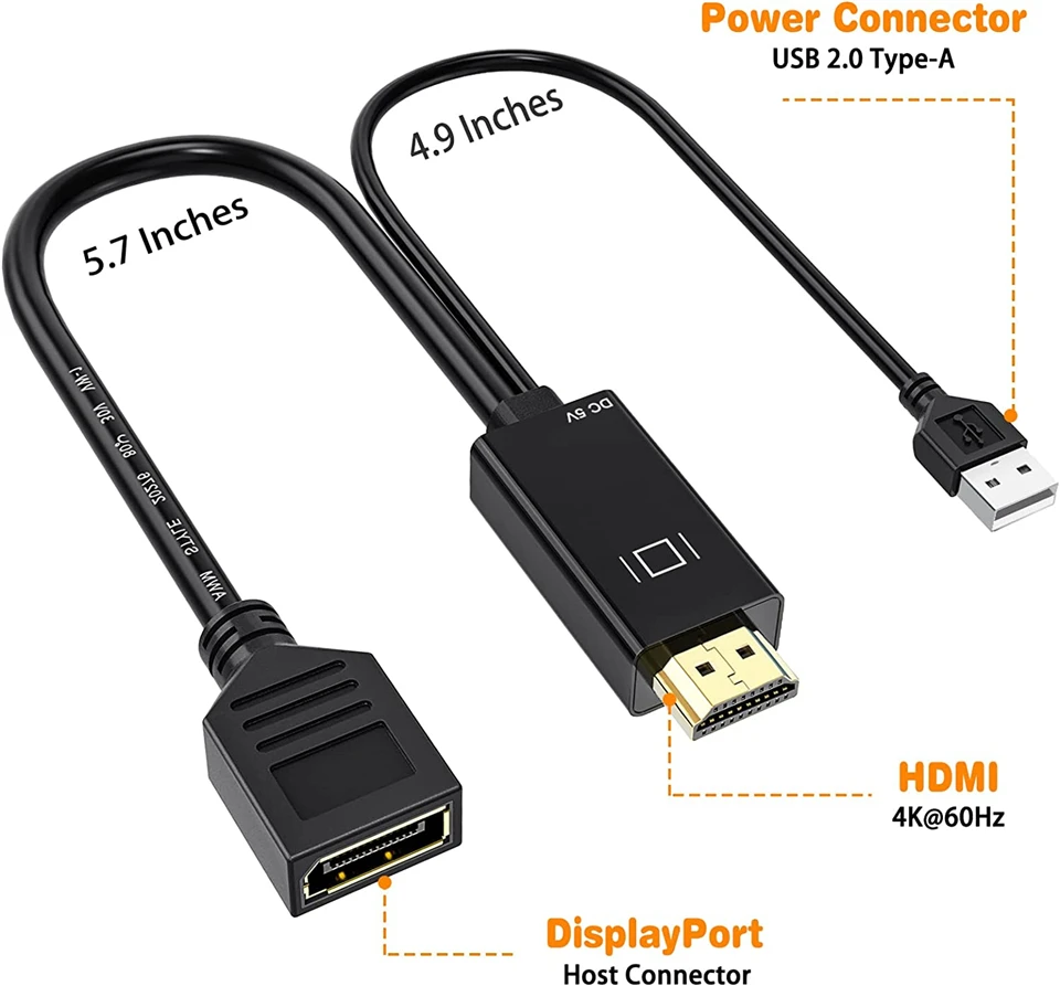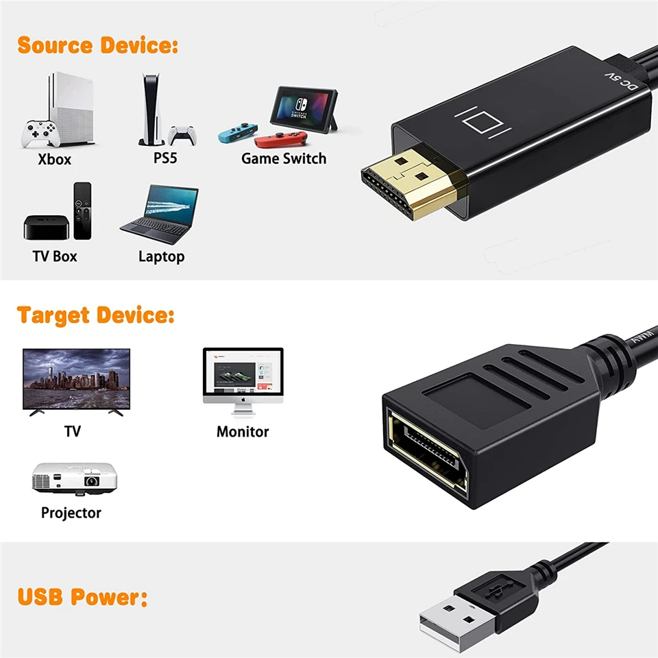· Adaptador HDMI a DisplayPort: el cable HDMI a DisplayPort transmite señal de audio y video de alta definición desde sus dispositivos HDMI al monitor/pantalla DisplayPort para transmisión de video o juegos. Nota: Este NO es un adaptador bidireccional. NO lo use para la conversión de Displayport a HDMI.