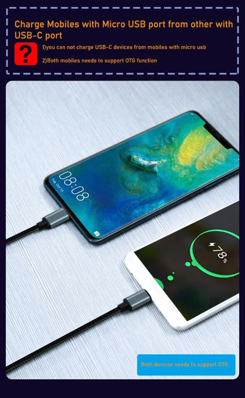 4) No es un cable bidireccional.No se puede cargar ni procesar la función OTG desde un móvil con Micro USB a un móvil con puerto USB-C.