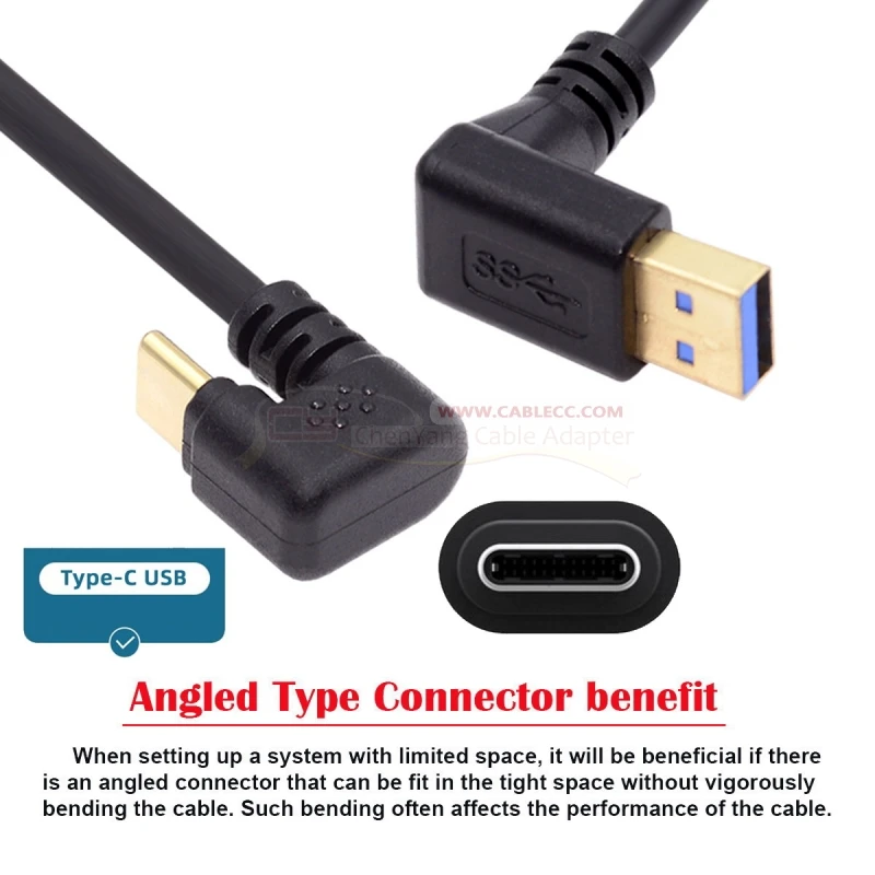 El conector tipo C tiene ángulo trasero opuesto en forma de U. El tipo en ángulo le permite conectarlo a un puerto hembra, incluso si el espacio alrededor del puerto es limitado.