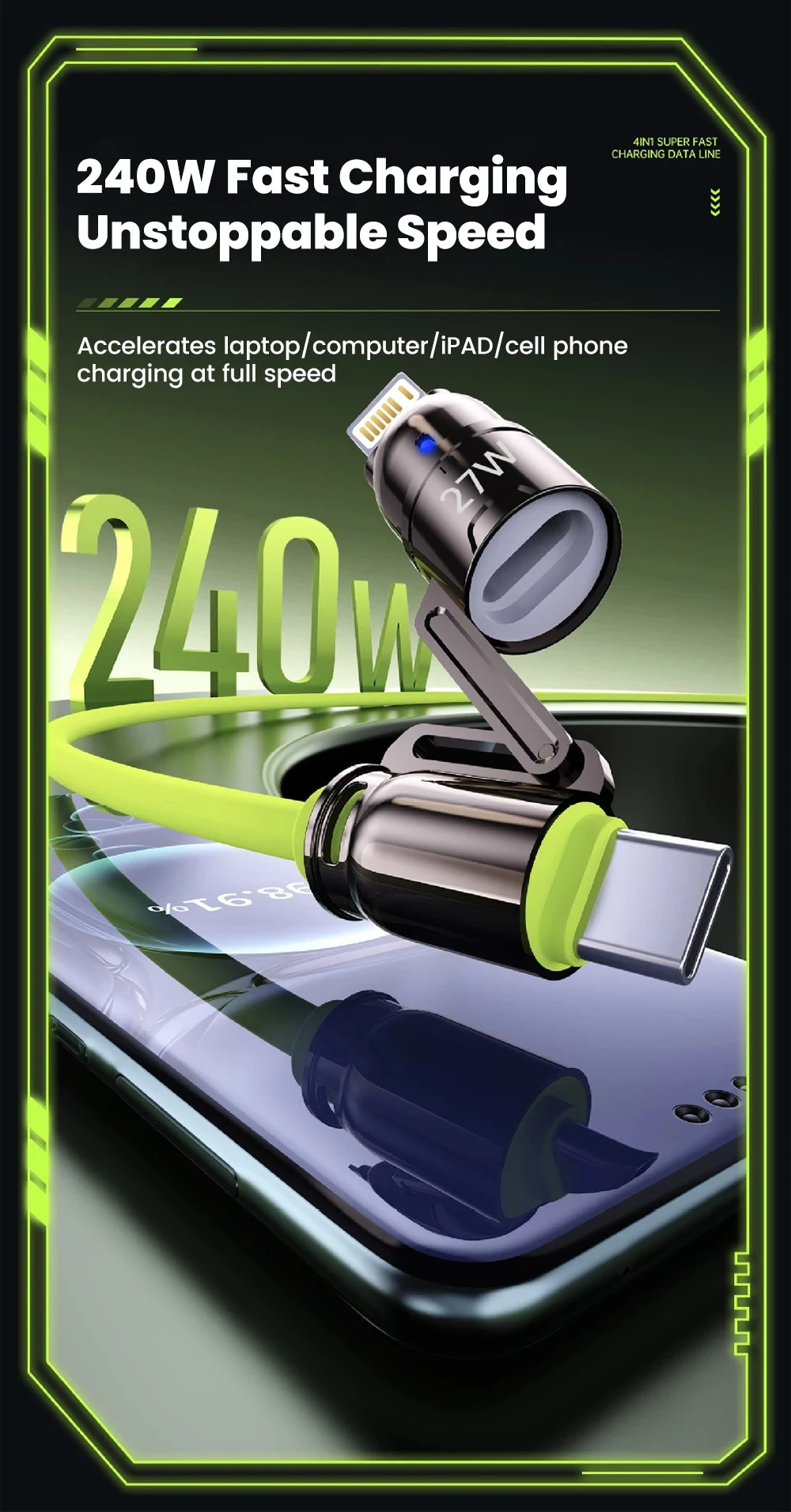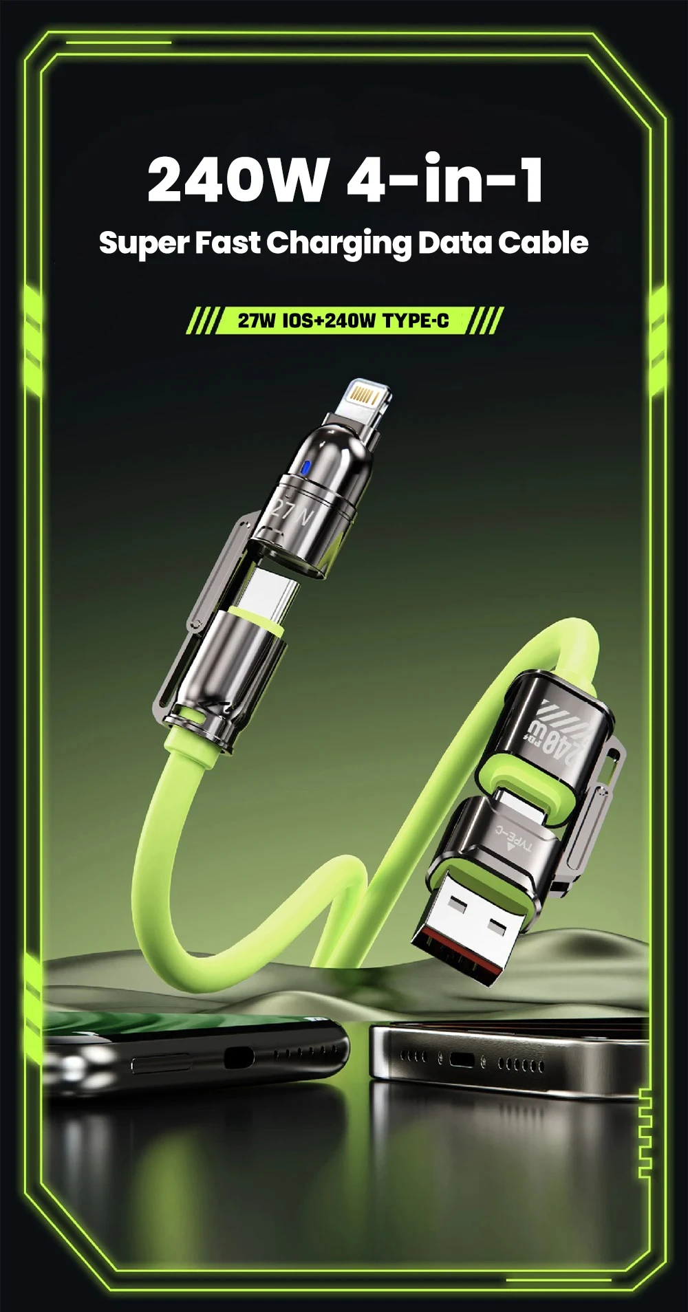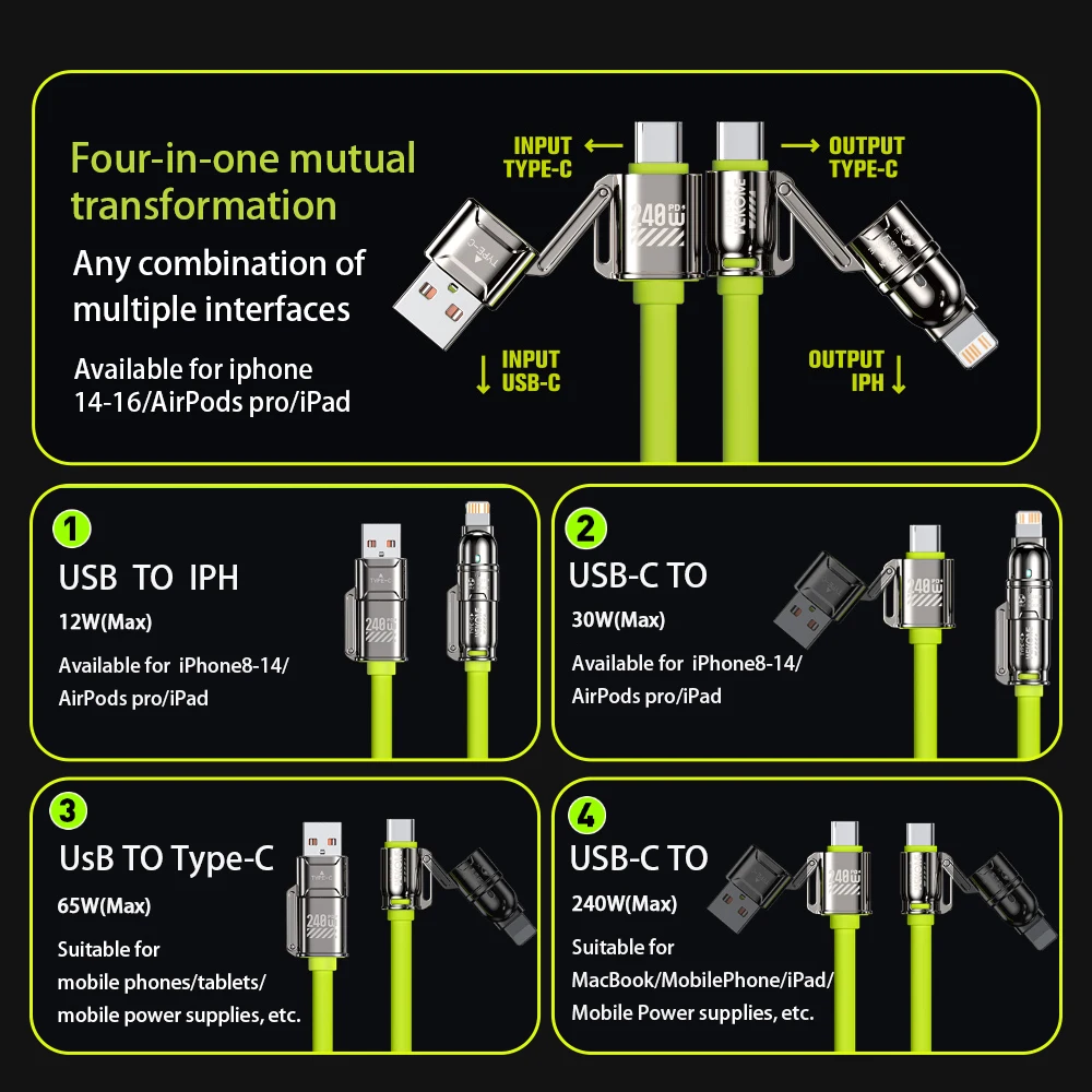 Comprar Cable de datos de carga rápida USB 4 en 1 de 240W, Cable de aleación de Zinc USB C a tipo C para teléfono móvil iPhone 15 16 Samsung Huawei Xiaomi 15