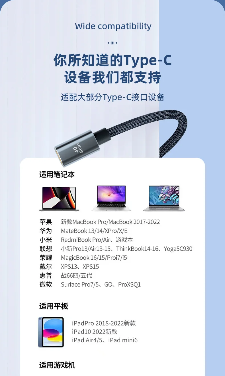 Este cable USB4 tipo C es ampliamente compatible con la mayoría de los dispositivos (principalmente portátiles), como Mac Pro 2020,2019,2018,XPS,