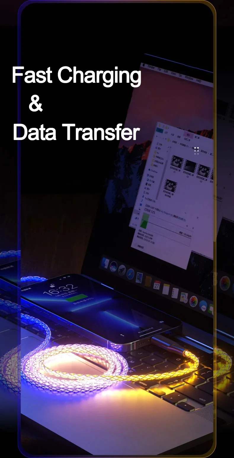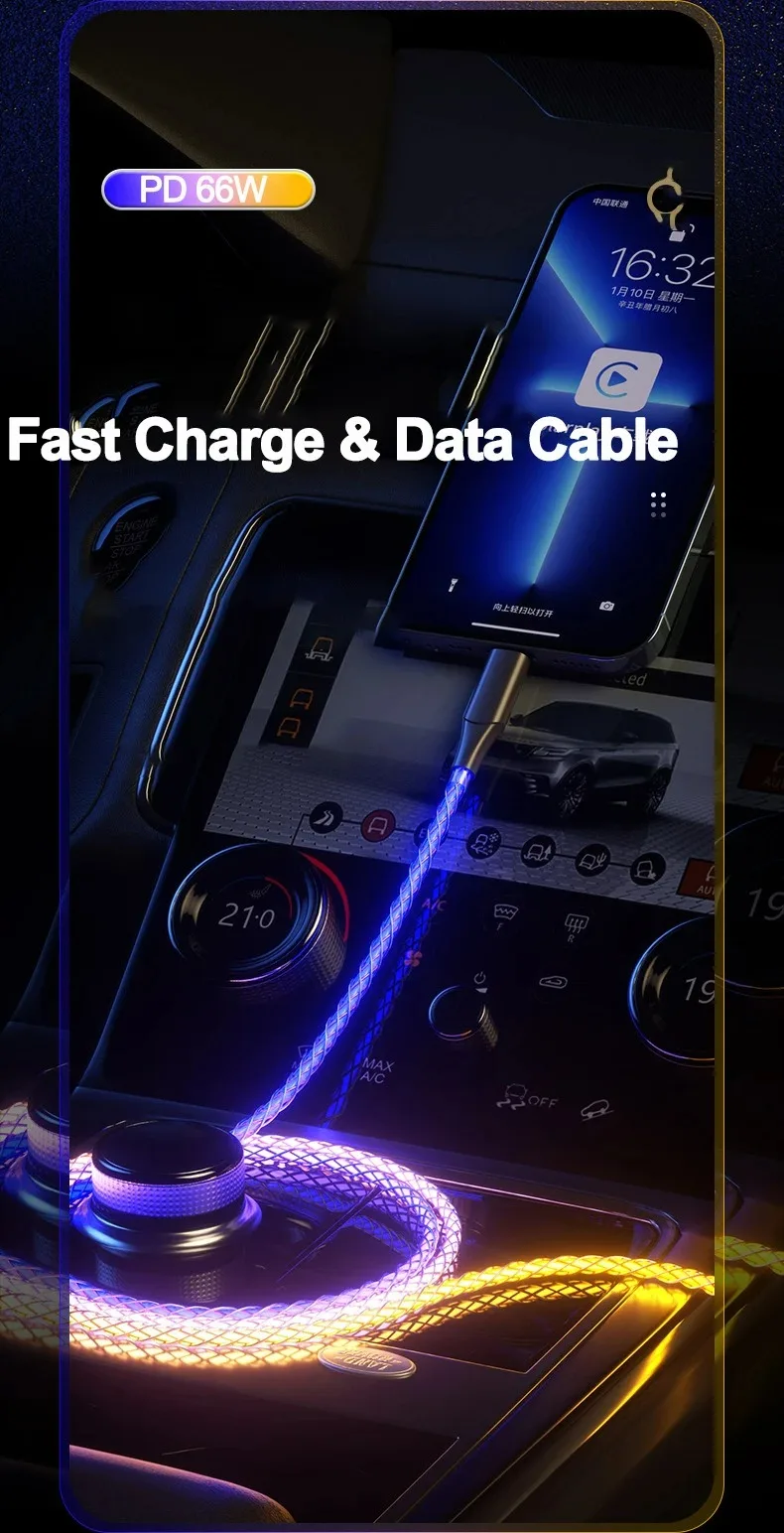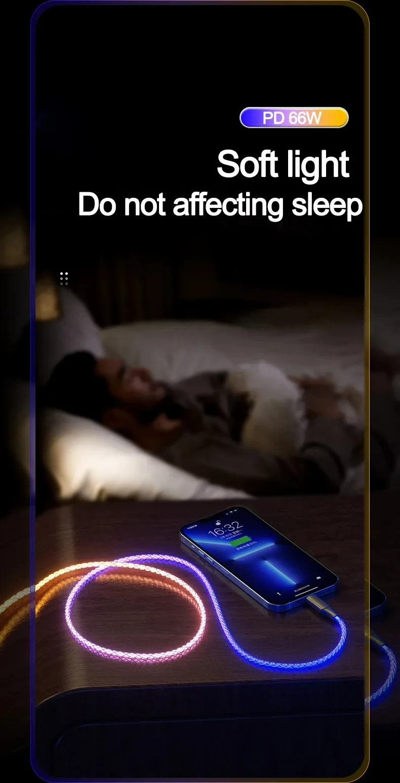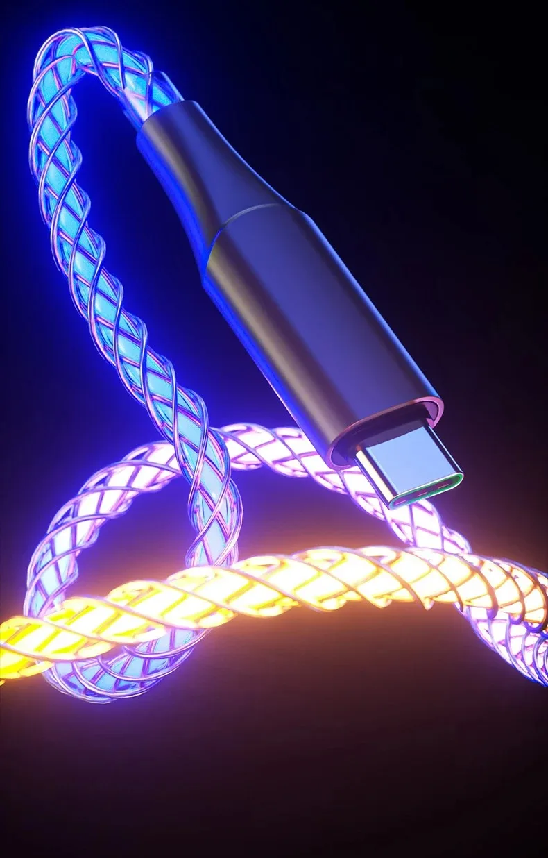 Cable de datos de luz degradada luminosa RGB de carga rápida de 66W 6A cargador tipo C para iPhone 16 Pro Huawei Samsung Cable de datos