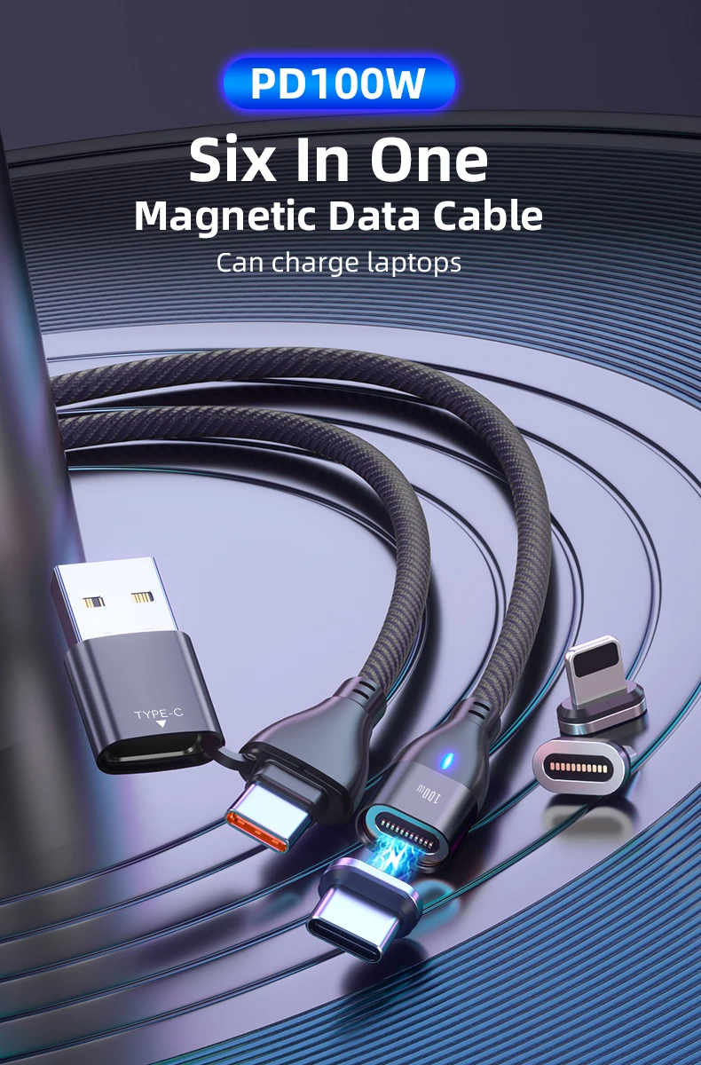 Cable de datos magnético para teléfono de carga rápida PD 6 en 1 - Salida de 100 W compatible con computadoras portátiles y múltiples interfaces