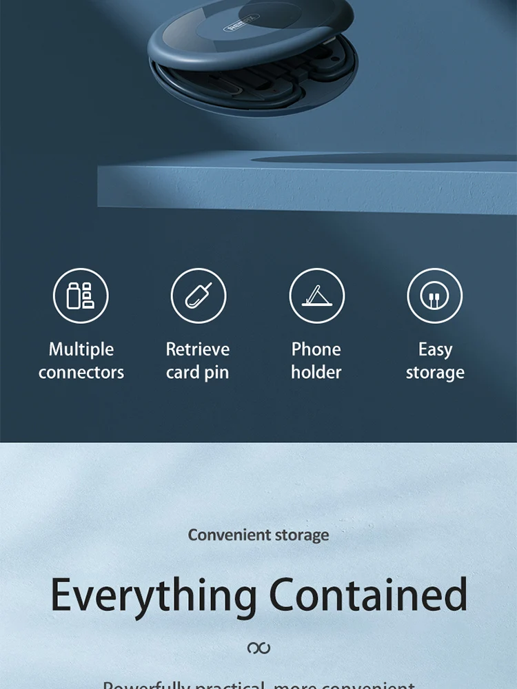 Esta Mini caja de almacenamiento de dispositivos digitales viene con 4 puertos diferentes, incluyendo Android, Lightning, USB y tipo C, que se pueden convertir, cargar, transferir, etc.