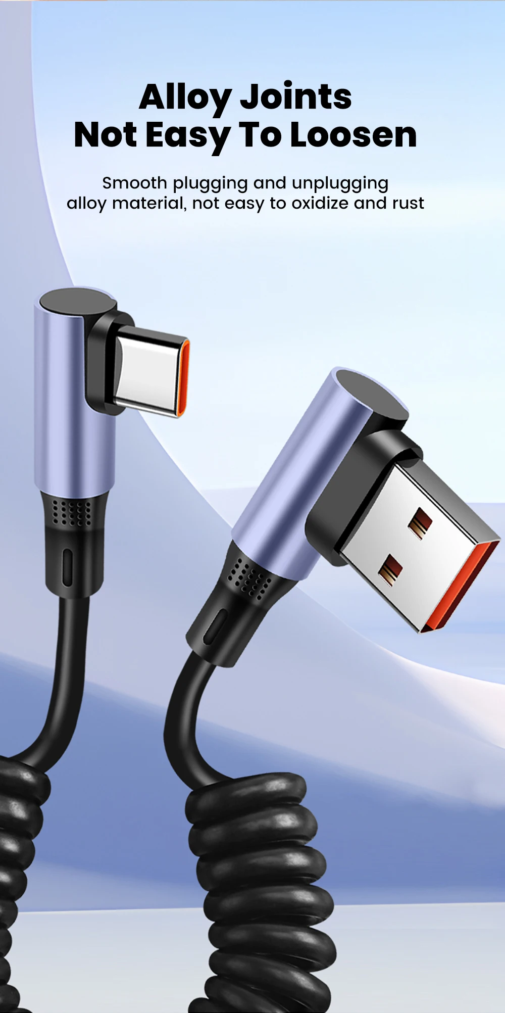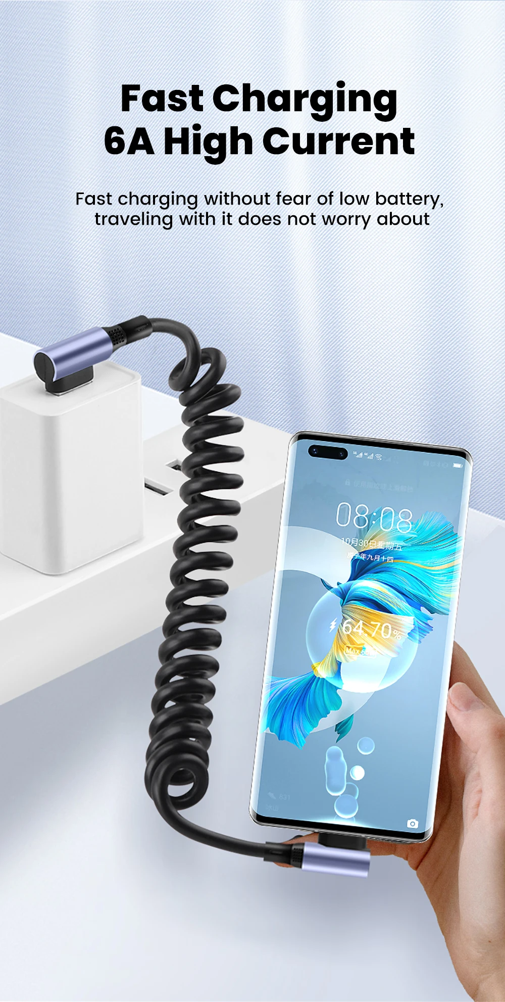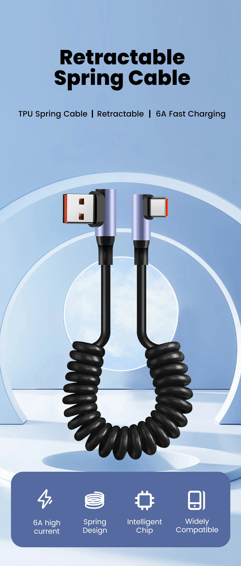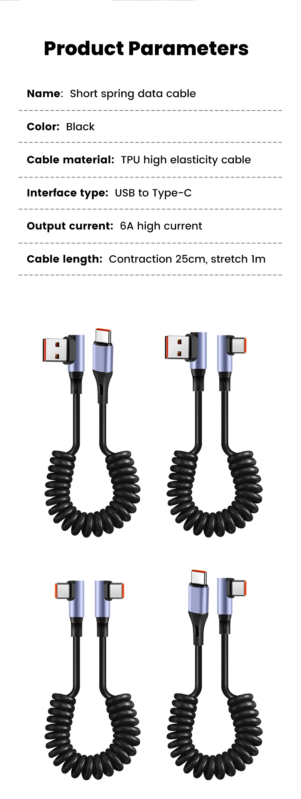 Cable de datos de resorte de doble codo 6A Cable de carga rápida retráctil tipo C a tipo C para iphone 15 16 Samsung Huawei Cable USB C