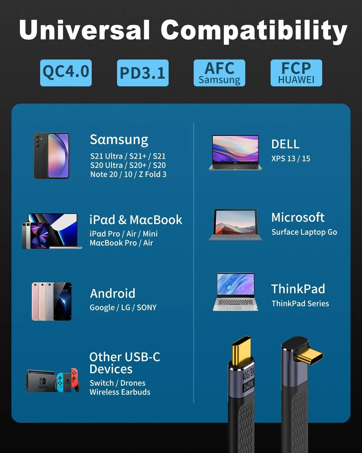 【Uso amplio】este cable corto USB C a USB C puede ser compatible con USB4, Thunderbolt 4, Thunderbolt 3, como MacBook Pro, serie Spectre, iPad, SSD.Compatible con versiones anteriores de USB3.2/USB3.1, USB2.0, como Switch, Steam deck, docks.