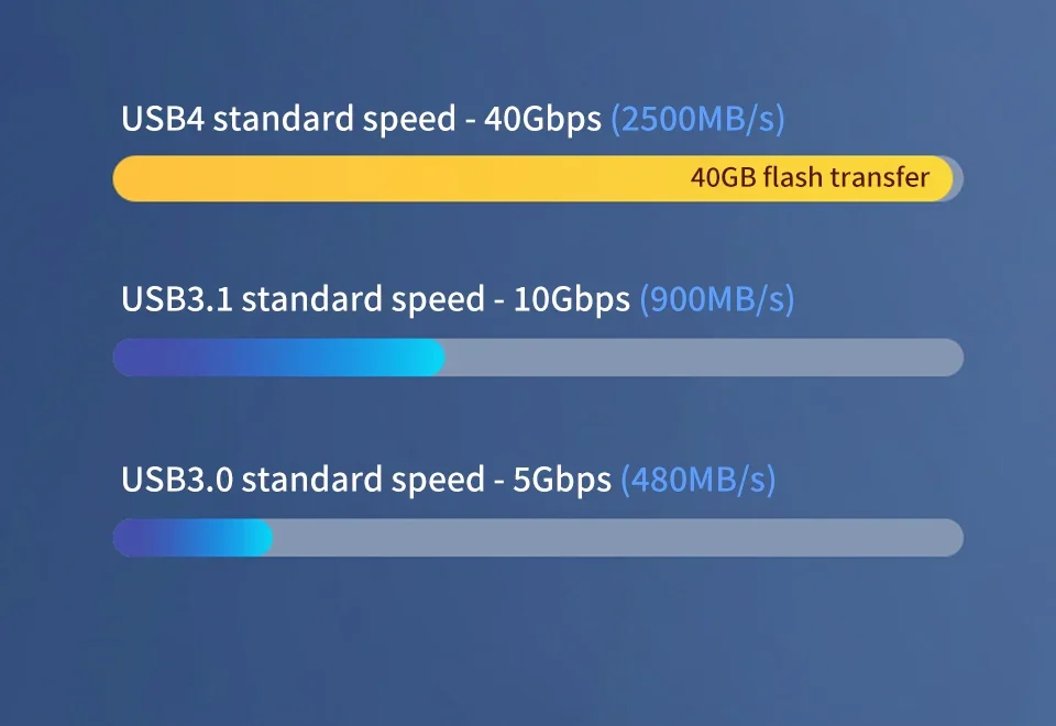 Velocidad de transferencia de 40Gbps: velocidad de transferencia de datos del cable USB4 de hasta 40Gbps. Puede copiar 14 horas de vídeo HD o 25.000 fotos en un minuto a velocidades de hasta 40 Gbps. NOTA: La velocidad de transferencia de datos dependerá del puerto que esté utilizando. Si se utiliza en la transmisión de audio y video, ambos dispositivos deben admitir funciones de audio y video.