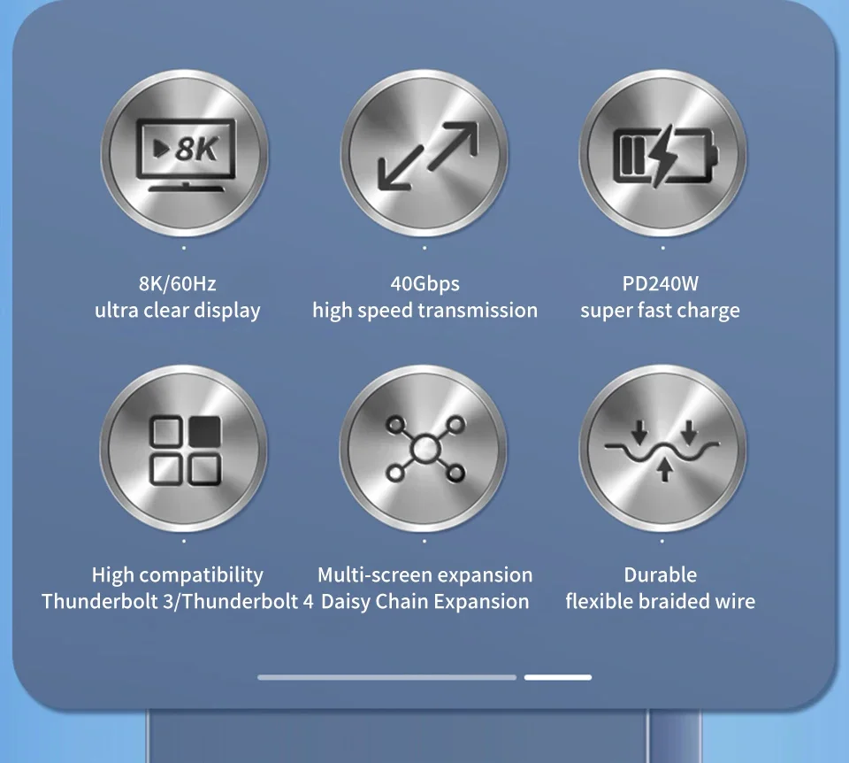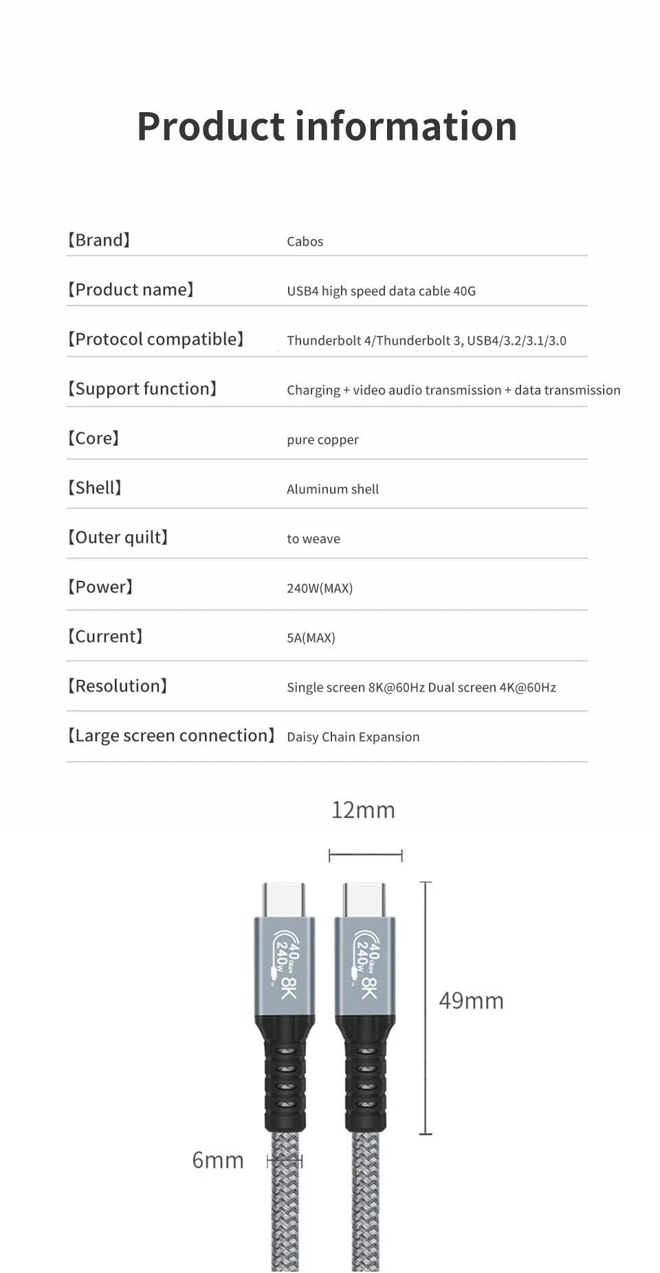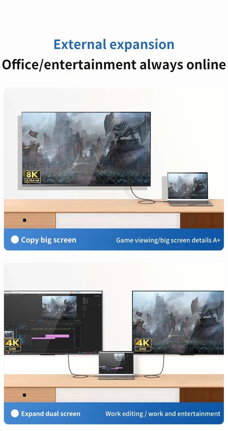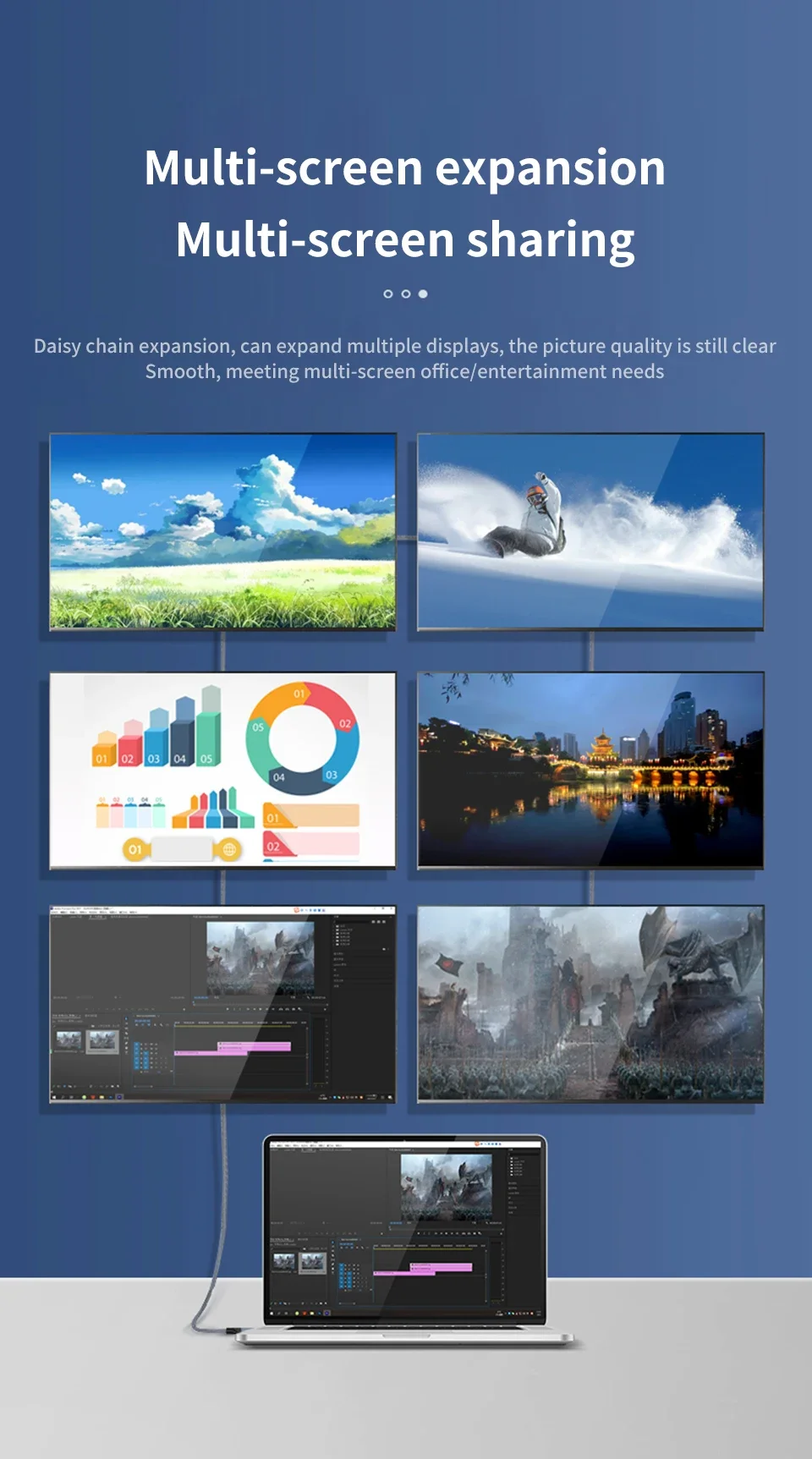 Vídeo de 8K a 60Hz: el cable de la USB-C disfruta de una resolución de vídeo ultra HD, el efecto de visualización es mucho mayor que el de los dispositivos 4K normales, con detalles más claros, lo que le brinda una mejor experiencia visual