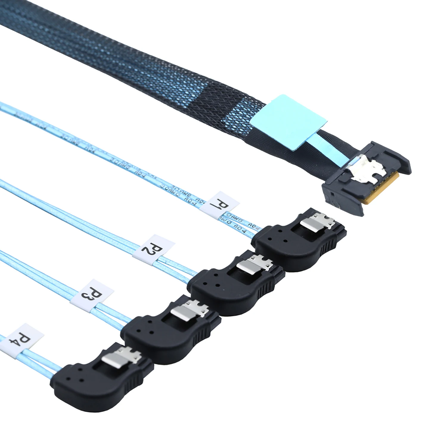 MCIO 4x SlimSAS Cable adaptador de datos de servidor SATA de 7 pines de curva izquierda de 38 pines a 4 puertos es un cable de transferencia de datos de alto rendimiento Diseñado para servidores de alta densidad y sistemas de almacenamiento. Los detalles se describen de la siguiente manera: