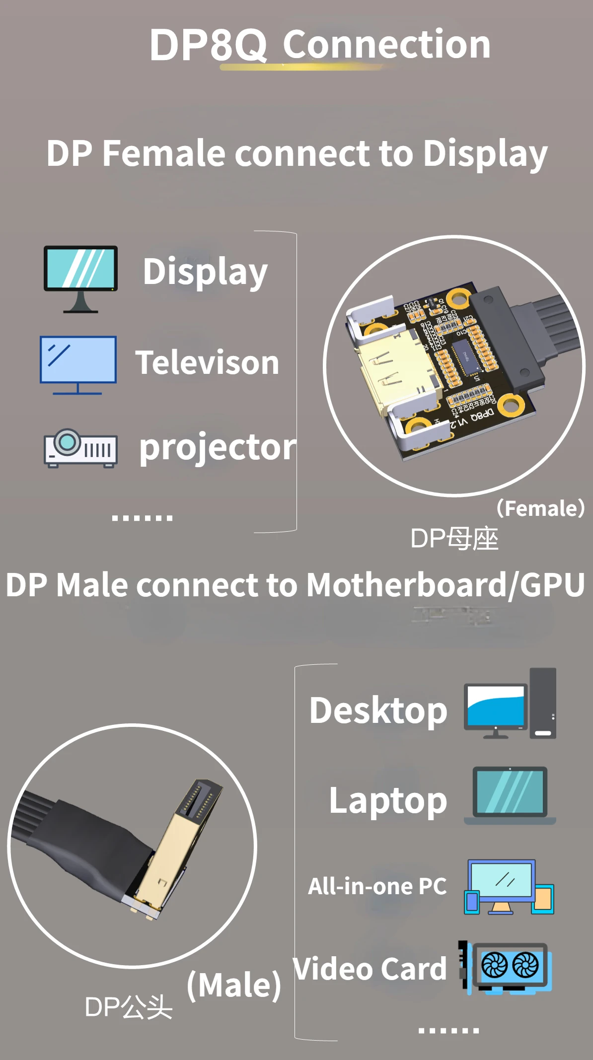 Nota 3:El modelo DP8Q con una señal de chip de relé es unidireccional, el extremo hembra debe estar conectado a la pantalla, el otro extremo de la cabeza macho debe estar conectado a la placa base o tarjeta de video