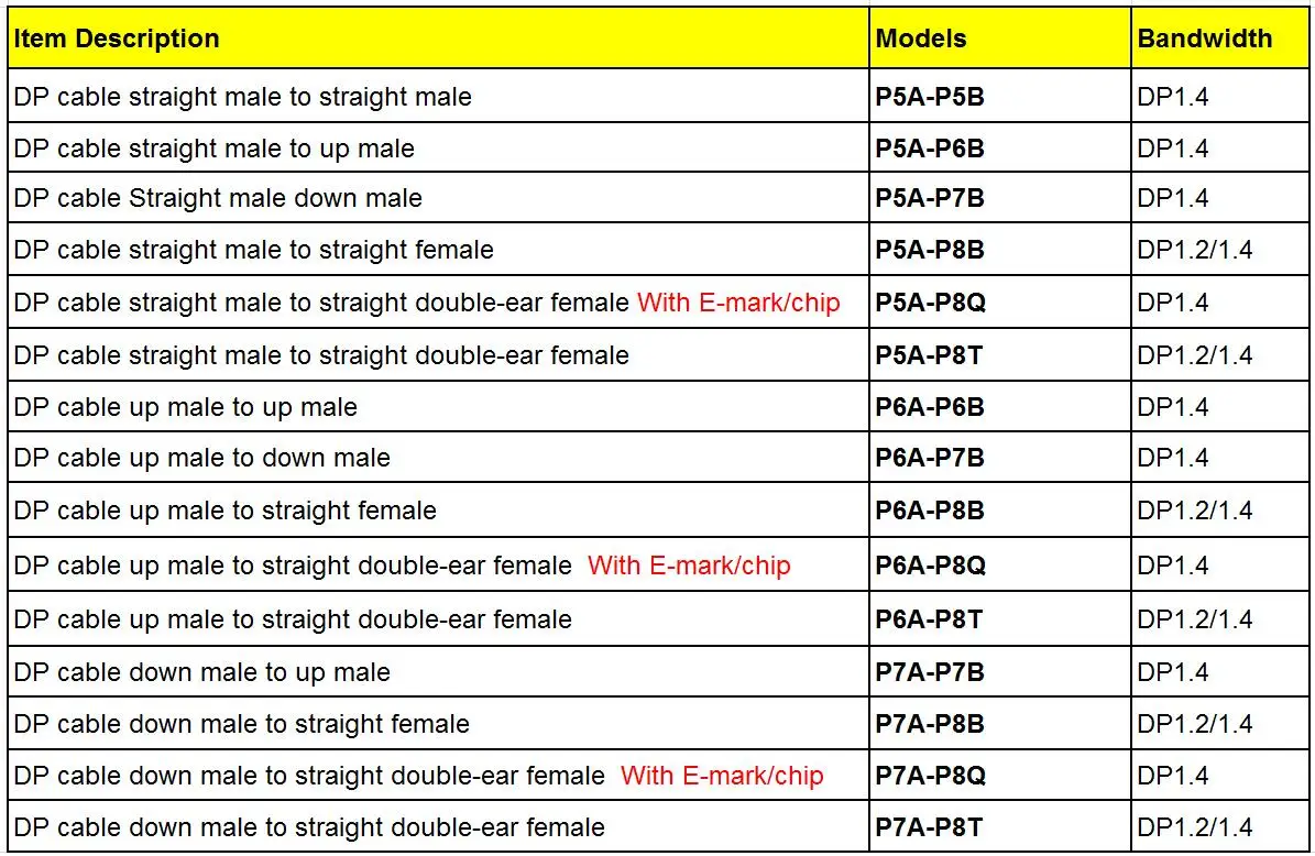Note 1:DP8B and DP8T have no E-mark/chip. After two DP lines are connected in series, the signal attenuation may not meet the DP1.4 full speed. DP8Q with E-mark/chip, active chip technology can enhance the signal, support DP1.4 full speed