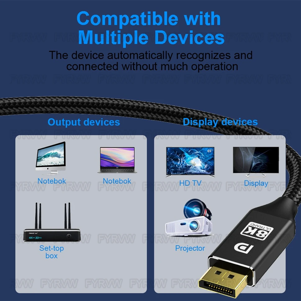 【Cable DisplayPort de 16K 2.1】El cable Displayport Silkland 16K 2.1/2.0 admite altas resoluciones de 16K (1360*8640) a 60 Hz con DSC, 8K a 120 Hz, 4K a 240 Hz/165 Hz/120 Hz/144 Hz, 2 K a 360 Hz. Cable Silkland 16K DP 2.1 certificado por la Asociación VESA. Admite HDR dinámico, HDCP 2.2, DSC1.2a. Compatible con versiones anteriores de DisplayPort 2.0 1.4 1,3, 1.2, 1.2a, 1.1 y 1.0. Admite paso de audio impecable para canales de audio digital sin comprimir a 7,1, 5.1 y 2.0. Admite tecnología de imágenes estéreo 3D