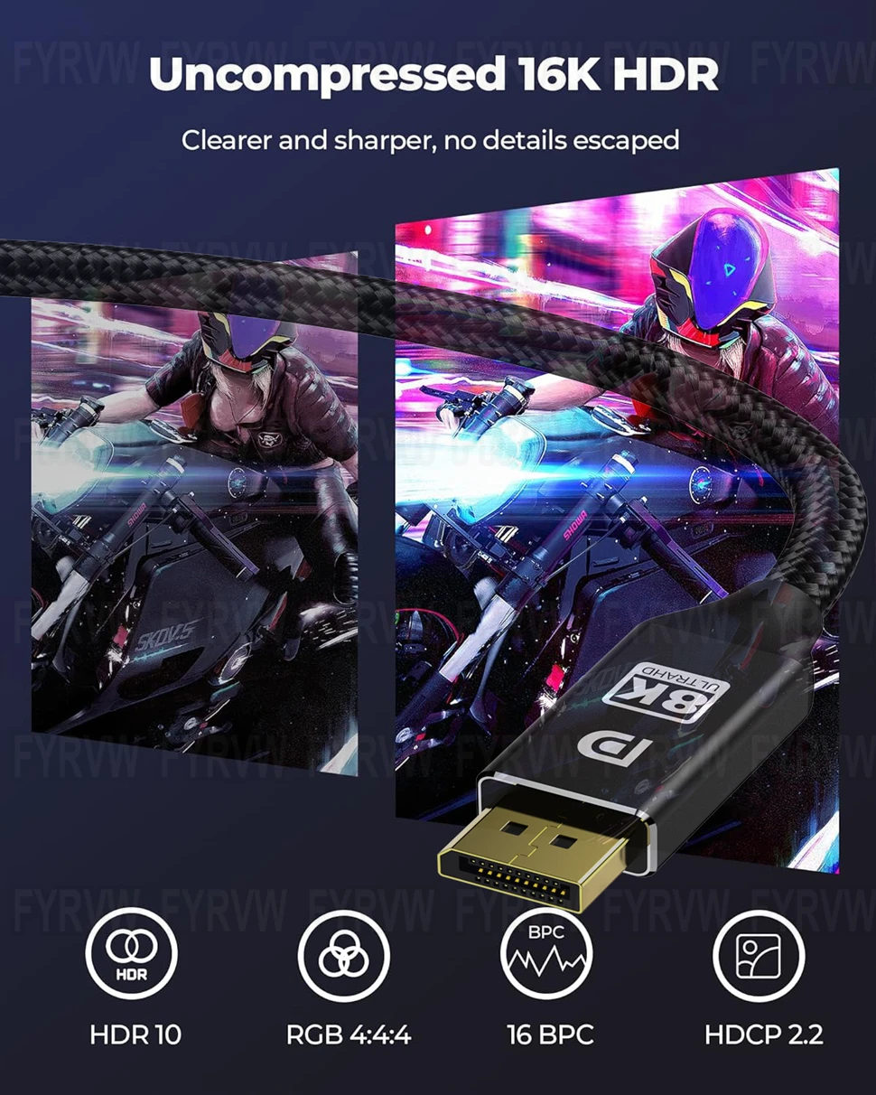 Cable DisplayPort Cable DP de 16K y 8K (8K a 60 Hz, 4K a 144 Hz) HBR3 compatible con 80 Gbps, HDCP 2.2, HDR10 FreeSync G-Sync para monitor de juegos PC con gráficos 3090